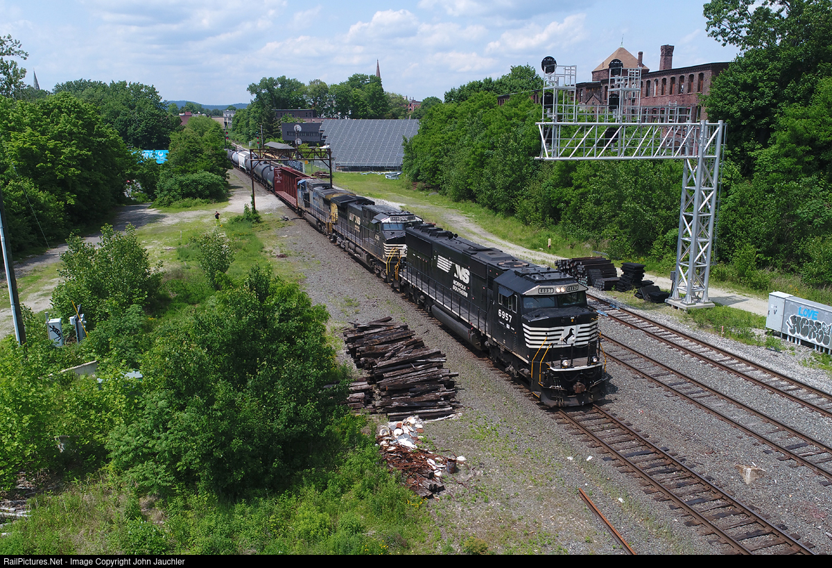 In a shot taken on the last day of operation for Pan Am Railways, Pan Am Southern (joint venture between Pan Am Railways and Norfolk Southern) 16R comes off the system's western main line to Mechanicville/Rotterdam Junction, NY. Just ahead lies the large East Deerfield Yard. Five years ago, many thought a Norfolk Southern purchase of Pan Am would be in the cards. Priorities changed for NS, and instead, CSX ended up with a major expansion into New England with its own purchase of Pan Am. 16R at the time this photo was taken changed symbols to ED-9 at East Deerfield for the remainder of its journey to Ayer, MA; it now apparently keeps the 16R symbol all the way. Not much else has changed.