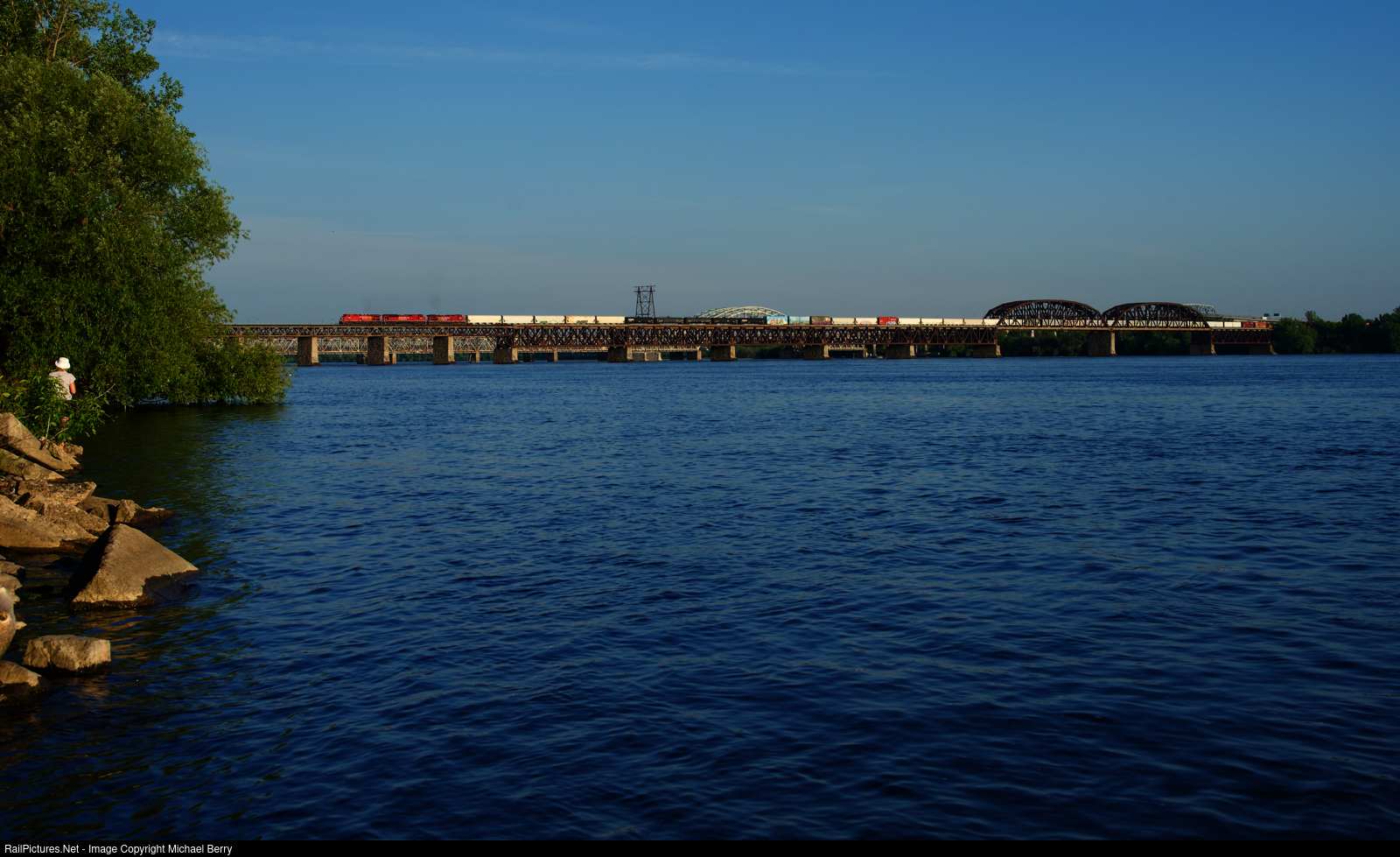 CP 223 crosses the wide St. Lawrence River on one of the longest days of the year.