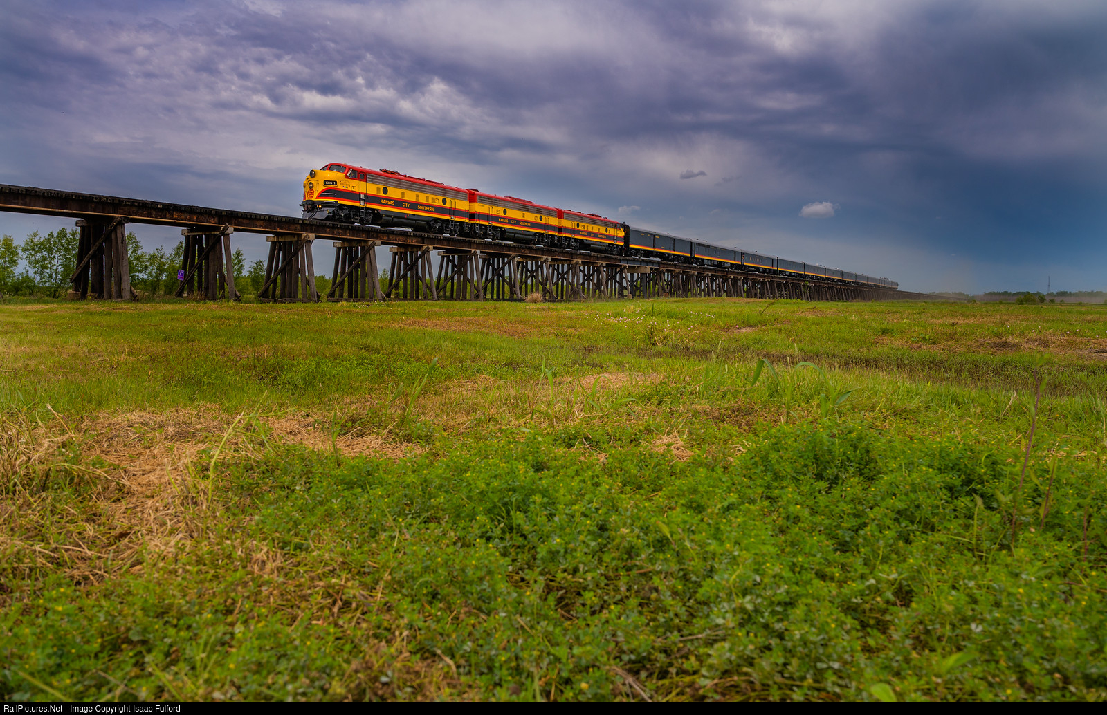 Battling some hazy/high clouds is the fully loaded KCS business train. The governor of Louisiana, CP CEO Keith Creel, KCS CEO Pat Ottensmeyer, Amtrak president Steven Gardner, and the head of the FRA, Amit Bose, were all onboard this Amtrak inspection trip. The hazy atmospheric conditions led me to underexpose the image significantly in the field in order to save some of the highlights from the sky. I think it worked well as the business train made its way across at a sultry 10mph. No doubt the putrid shape of the KCS bridge over the spillway was a topic of engineering discussion by those onboard. A "successful" trip? Only time will tell as we have yet to see if the STB will approve the CP/KCS merger, and the Amtrak expansion. No matter what reason, however, it is always nice to see the vintage business train out rolling down the KCS.