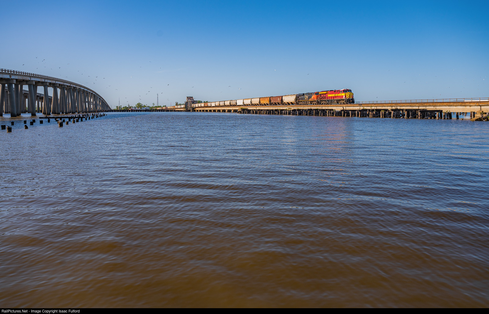 | CN G884 rolls south at the prescribed 25mph over the Manchac Pass drawbridge behind the Wisconsin Central Heritage Unit. The 3069 was one of 5 paint schemes from predecessor railroads that Canadian National repainted as part of the 25th anniversary of the companies IPO. The spotless weather lent itself to a good follow of this guy south from Osyka siding up the line on the Mississippi border south towards their destination of Reserve. This shot is the cream of that crop for me. Manchac Pass is the must have shot along the southern end of the former Illinois Central mainline. The small pass connects Lake Maurepas with the much larger Lake Ponchatrain for an eventual drain into the Gulf of Mexico through the Rigolets Pass.