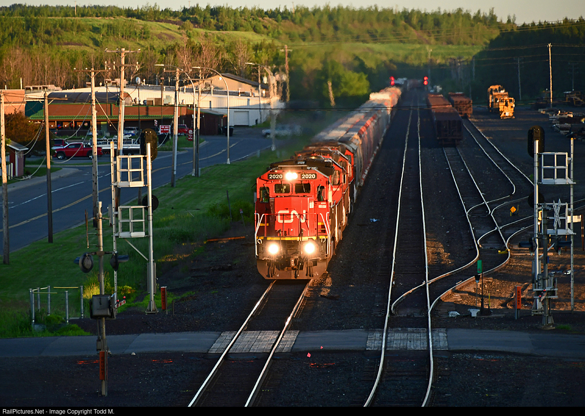 | Catching the last sliver of sunlight, the late afternoon/early evening trip from Proctor Yard to Symington (Winnipeg) has an interesting power choice in the fact only ore pool engines are moving this long string of freight up to Canada. CN 2020, BLE 903, with DMIR 409 and 405 along for the ride to have work performed on them. |