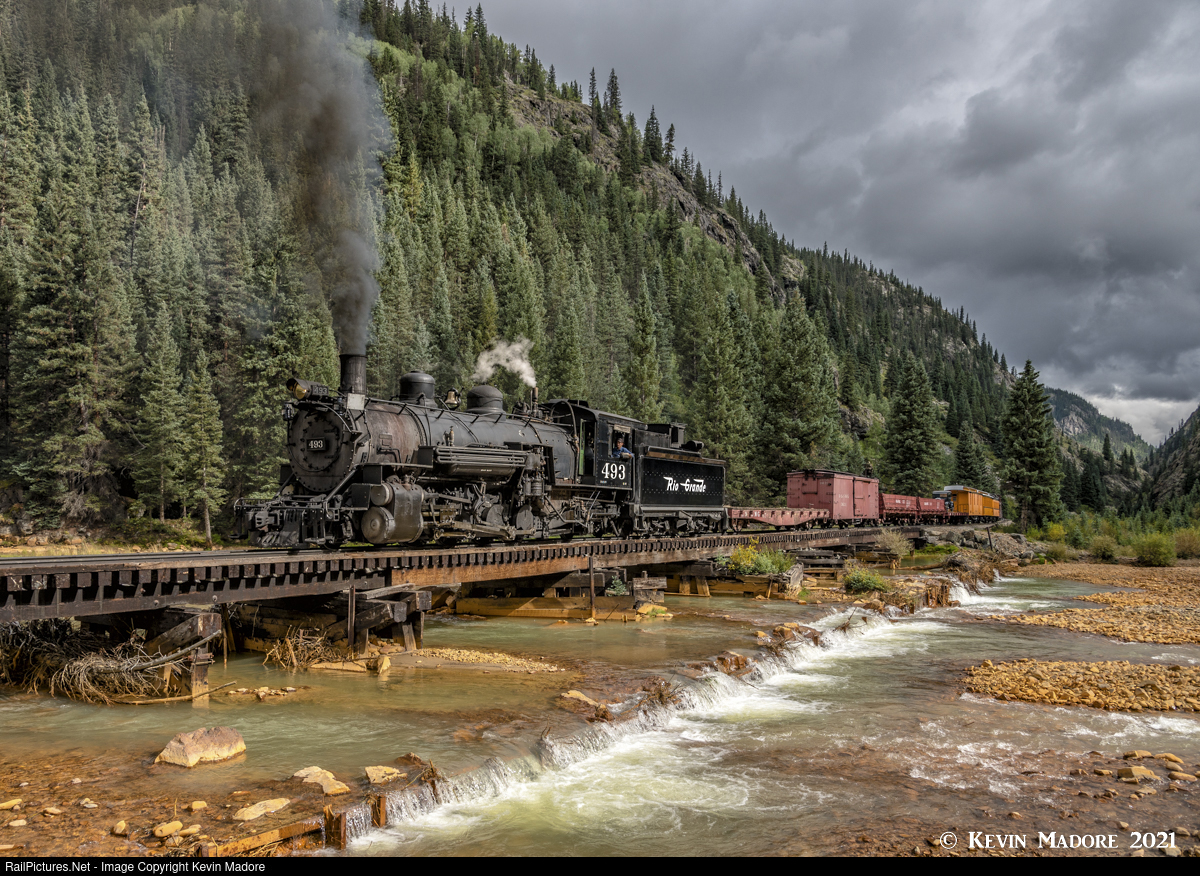 Up from the canyon.... A little over a mile and a half from the end of track in Silverton, CO, D&RGW K-37 #493 emerges from the Animas Canyon, crossing the river of the same name for the final time on her northbound trip. This so-called "Timber Bridge" at Milepost 495.25 is the last of 7 crossings that the trains make during the journey from Durango to Silverton, and from my perspective, the most photogenic, if caught in the right light. Sadly, the railroad has indicated that this long-standing relic is about to be replaced with something more robust, made of steel and concrete. While the scenery won't change much, such a structure will certainly have a different character than this one. I am told that like the situation at "Twin Bridges", a little over 5 miles south of here, the legacy bridge will simply be left in place and the new one built beside it. It won't have the serene and simple wilderness look that you see here. I am so glad that I was able to capture a Silverton Mixed here, just one last time.