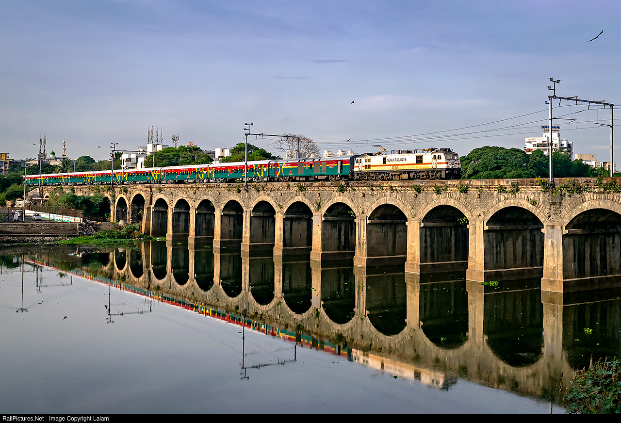 The train on the bridge is one of the most prestigious trains of Indian Railways -the Deccan Queen express . Just 2 days back, the train got latest LHB coaches . Here , this 92 years old Deccan Queen express crosses Harris bridge near Dapodi making a nice reflection in Mula river. Other images of the same train at same location with different coaches are in railpictures database