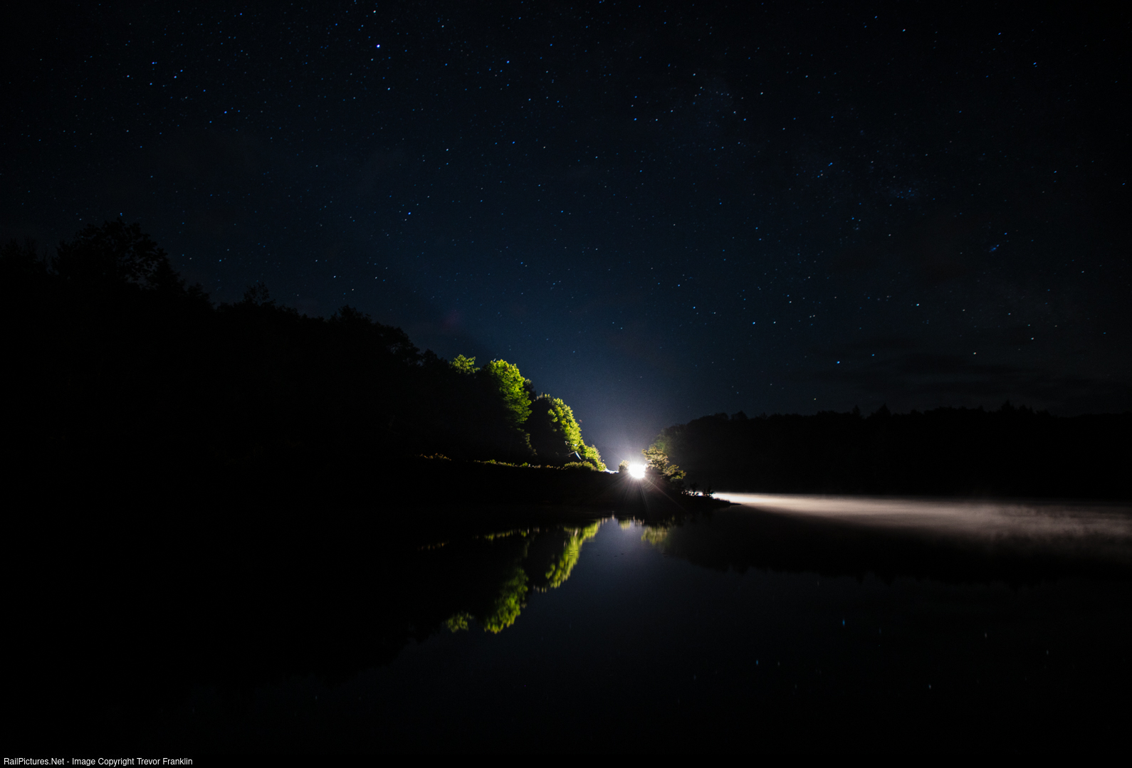 A few minutes after midnight this CN northbound is working hard, breaking the silence and briefly illuminating a misty McKechnie Lake underneath the stars at our makeshift campsite. It took a number of attempts to get the timing, exposure, and conditions right (clear sky, still waters...) for this one but persistence paid off and I was quite happy with the results.