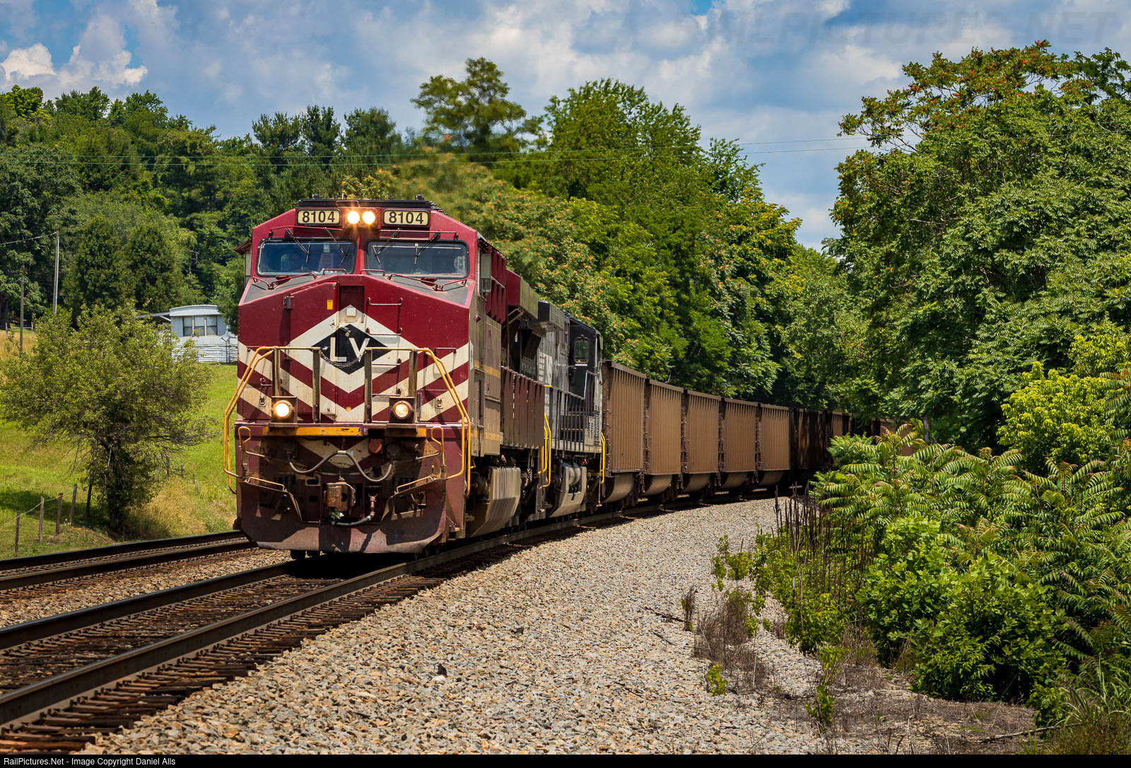 The Lehigh Valley heritage ES44AC leads hopper train NS 741 west through Shawsville, VA.