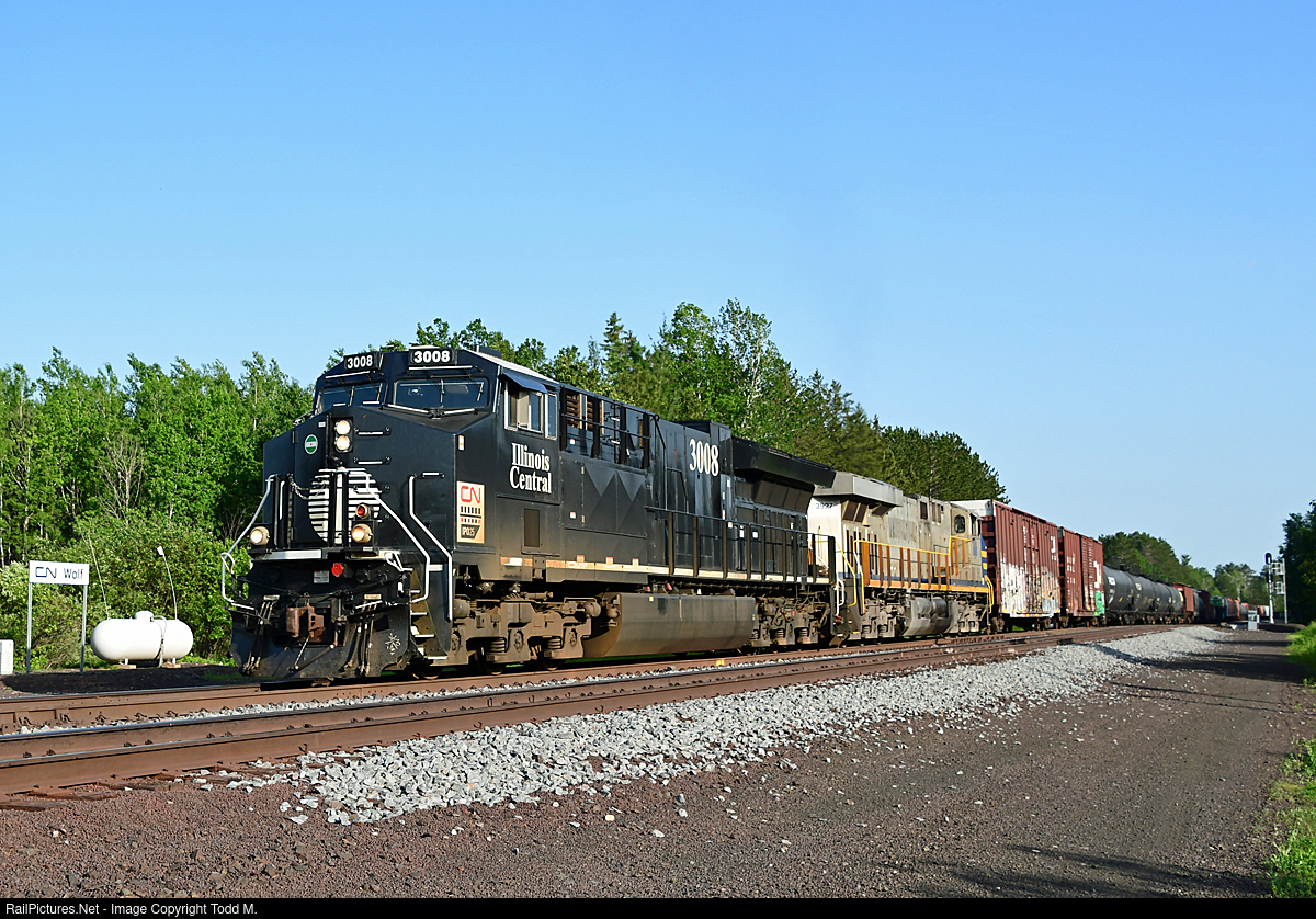 | Back underway with favorable signals, CN 3008 rumbles along through Wolf with train A439 in tow from Proctor Yard to Symington (Winnipeg). |