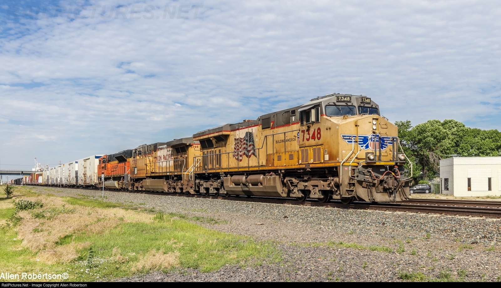 UP 7348, 5705, & BNSF 9100 eastbound with a manifest.