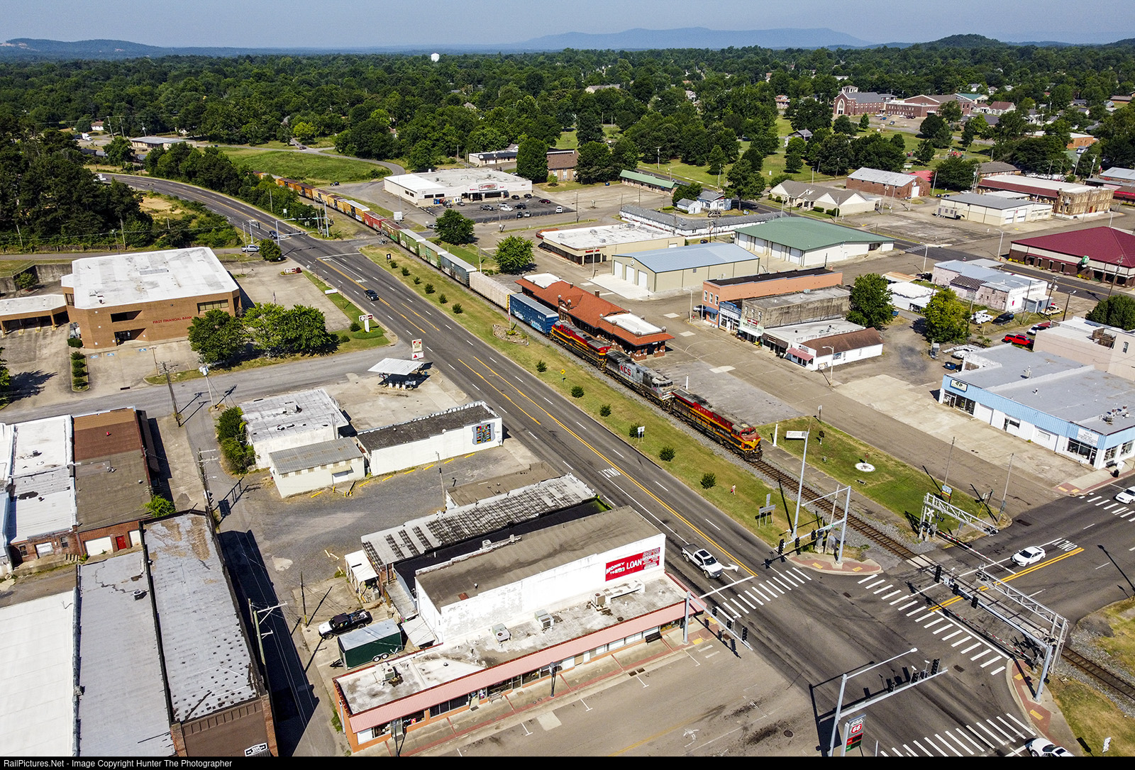With three GE units on the head end, a northbound manifest train cruises by the old depot - now a museum - in the middle of Mena, AR mid-morning on a hot and humid Sunday, June 26, 2022.