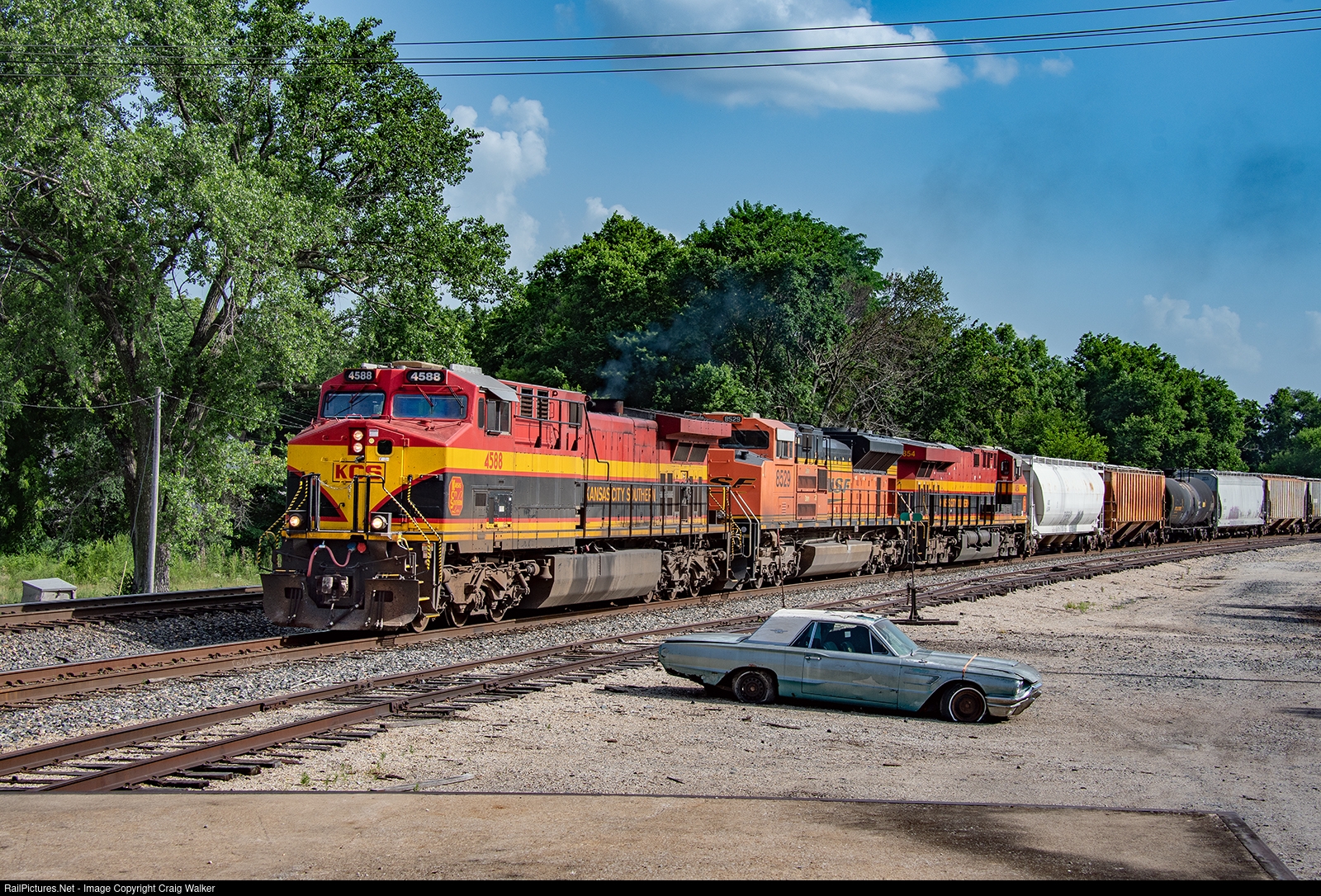 Having just completed a meet with a southbound grain train, Kansas City Southern merchandise train MSHKC17, heading from Shreveport LA to Kansas City MO, is just beginning to roll northward again, passing an extra-fine automobile as it does. KCS AC4400CW 4588 (ex-KCS 2013), BNSF SD70ACe 8529 and KCS ES44AC 4854 have roughly 20 miles to go before reach KC’s Knoche Yard. (Grandview, Missouri – June 18, 2022)