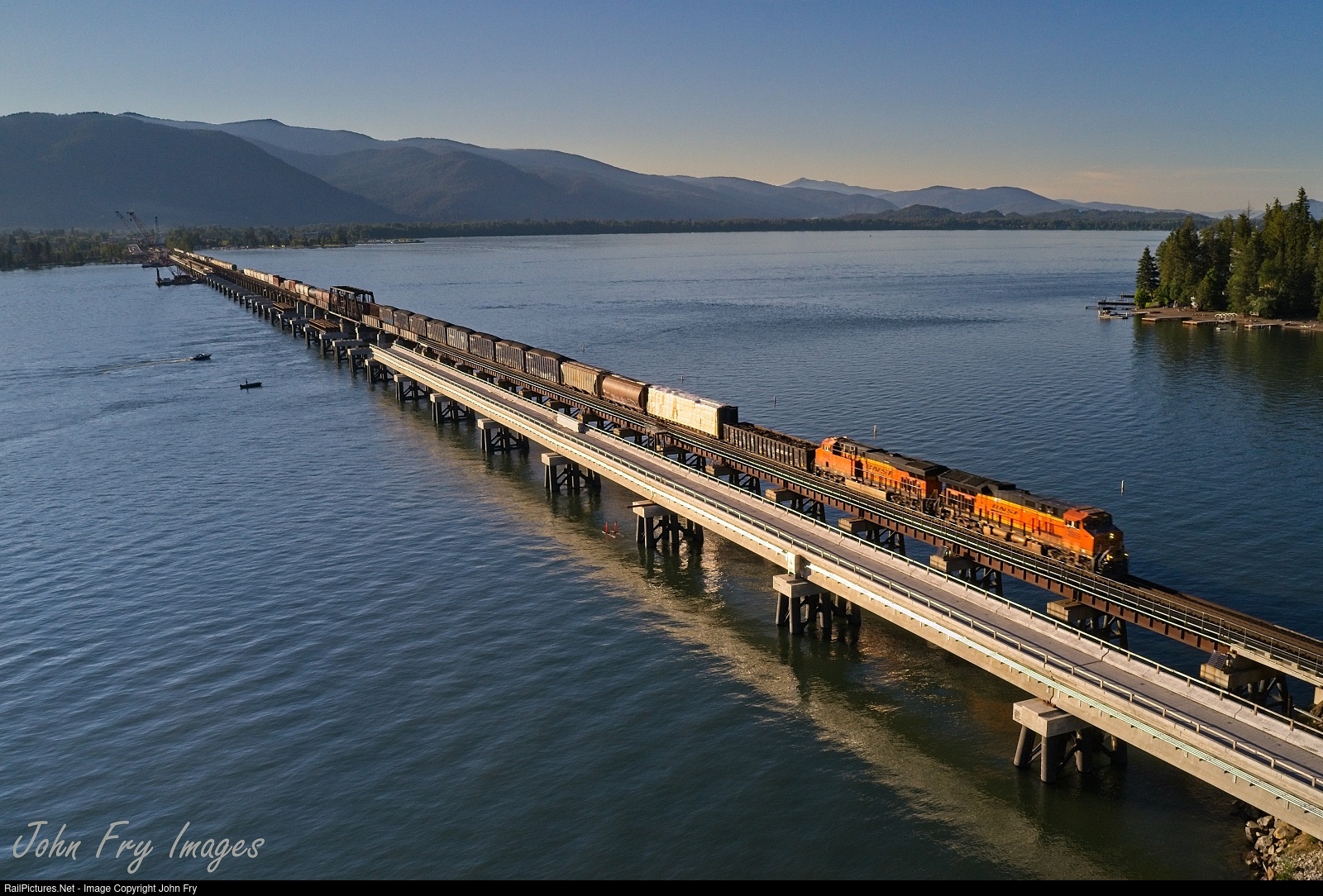| An eastbound mixed freight has just come off the MRL at Sandpoint, ID. The head end has nearly crossed the entire 4800' length of the original span and the continued progress is visible on the second span. |