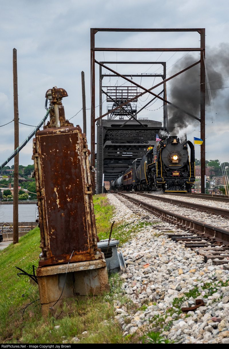 | Iowa Interstates famous Chinese “QJ” 2-10-2 is seen here crossing the Government Bridge from Iowa into Illinois for the final time on its boiler ticket. This would mark the conclusion of the first of two days of its rebuild tours, as it enters its 1492 the following week. This train sports not only an American flag, but a Ukrainian flag as a statement to the troubling times overseas. |