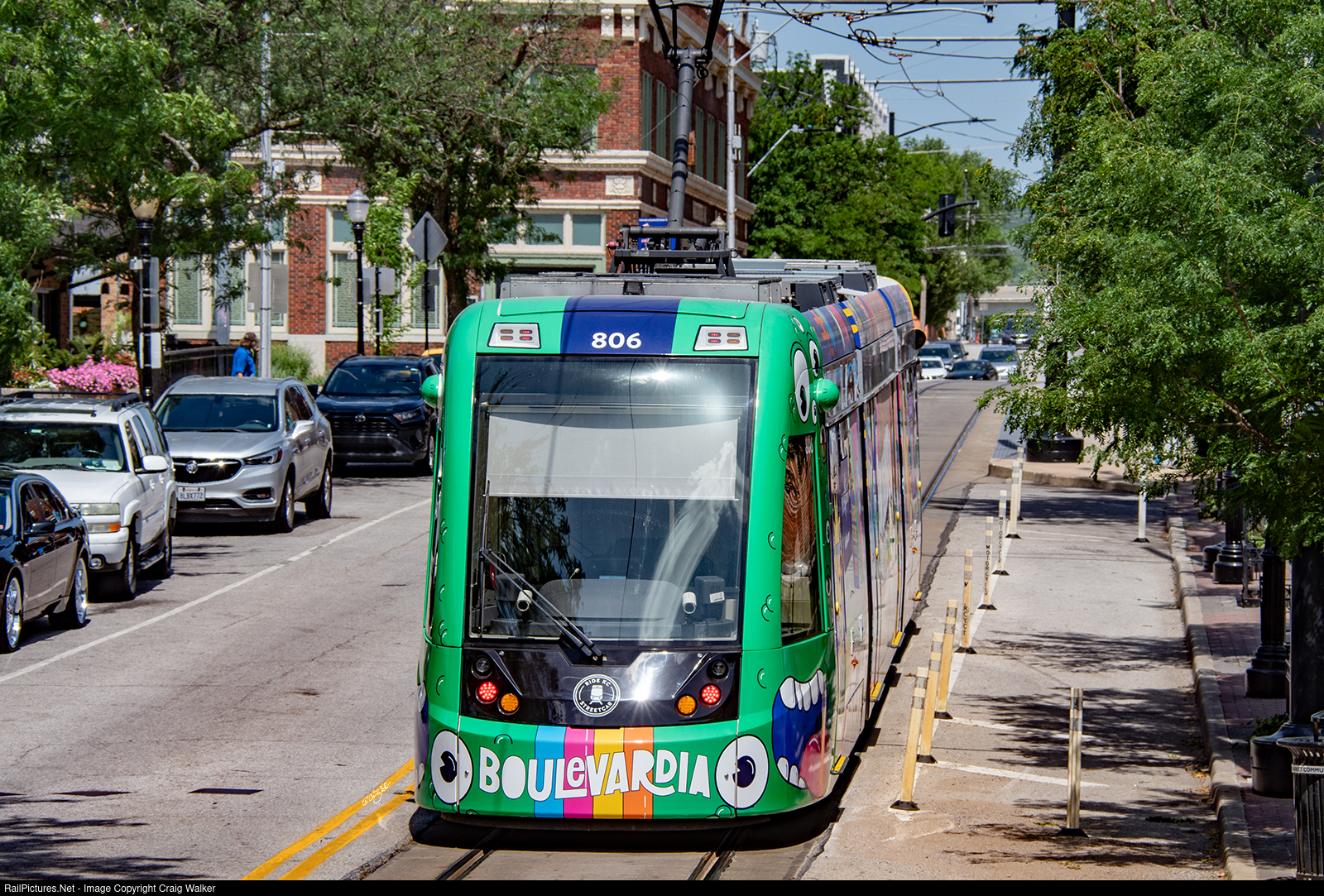 | One of Kansas City’s downtown streetcars heads down East 5th Street as it makes a loop through the River Market neighborhood before returning down Main Street to Union Station. Each of the city’s CAF Urbos 3 Light Rail Vehicles wears a different, distinctive and often colorful paint scheme. Car 806 is perhaps the most colorful! (Kansas City, Missouri – June 17, 2022) |
