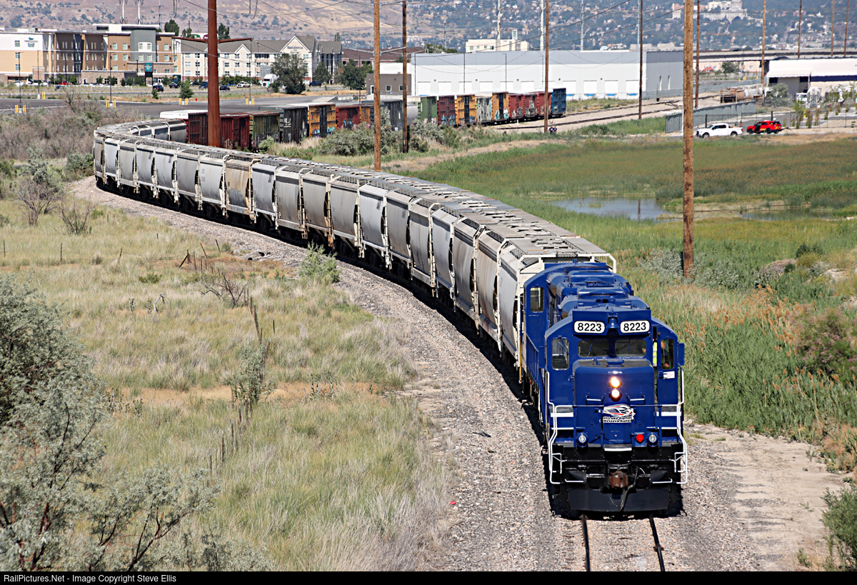 | I was finally able to get Salt Lake Garfield and Western's GP9's in action in their new Patriot Rail themed paint jobs. I was aided by a massive brush fire going on behind the train which I believe stopped them long enough. That I was able to flip around on the freeway and get in position for a shot. SLG&W is an extremely difficult railroad to photograph. |