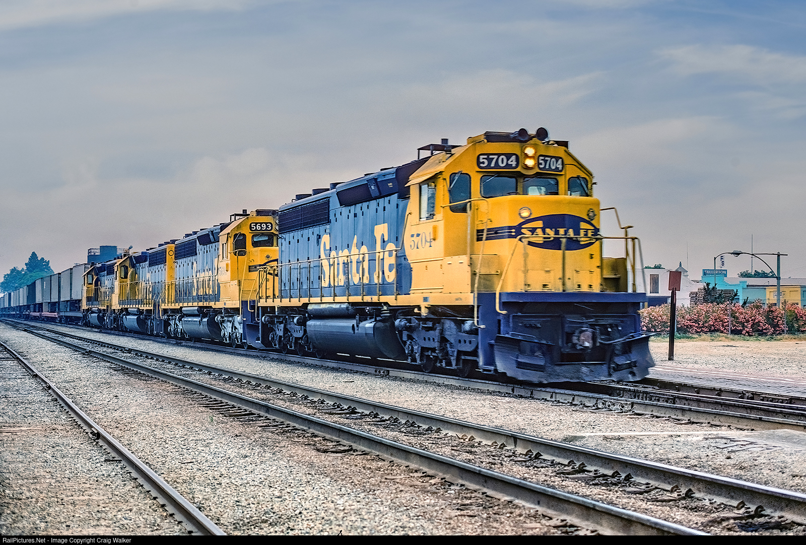 The American Bicentennial is just a year off, and Santa Fe’s fifth Bicentennial locomotive, SD45-2 5704, has still not been repainted. By this point, ATSF 5700-5703 were all painted and usually found on the point of the hot Super C piggyback train. But here was the fifth Bicentennial unit, still awaiting its turn in San Bernardino’s paint shop, wearing its original paint while leading a quartet of SD45-2s on the Super C. In fact, poor 5704 would not get the patriotic colors worn by its sisters for another six months, emerging from the paint shop on January 13, 1976, some eight months after the fourth Bicentennial unit, ATSF 5702, got repainted on May 12, 1975. (Fullerton, California – July 24, 1975)