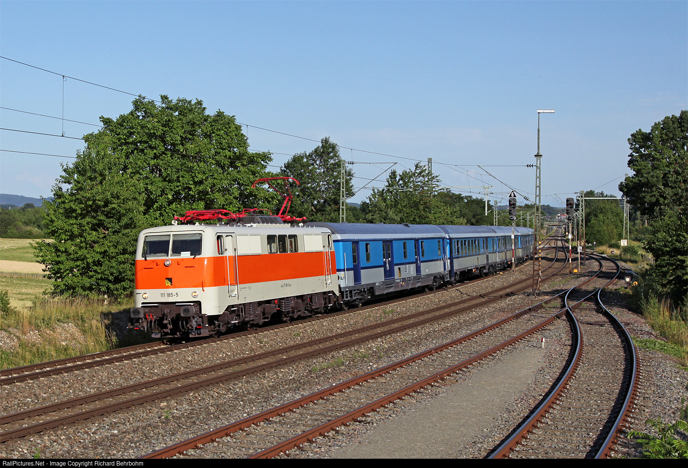 | Special train for passengers with bikes from Radolfzell near the Lake Constance back in the evening to Stuttgart. The locomotive and the rebuilt cars come from Deutsche Bahn, are repainted and owned and operated by Schienenverkehrsgesellschaft Stuttgart. |
