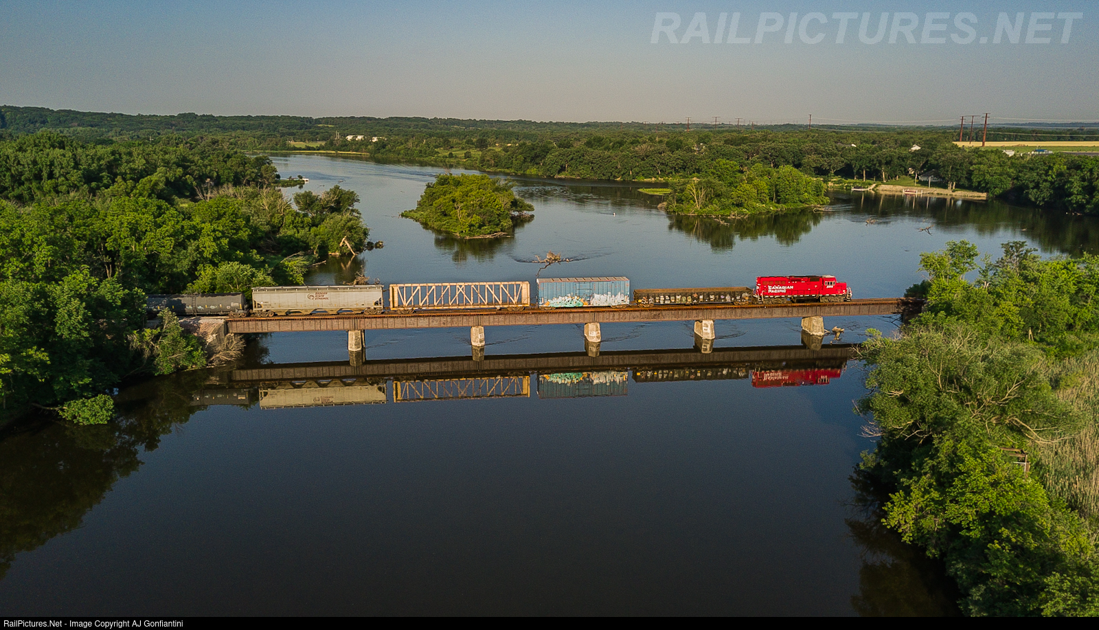 CP 2214 is in charge of the K66 local as it heads across the Rock River bridge en route to Janesville to interchange cars with the WSOR.