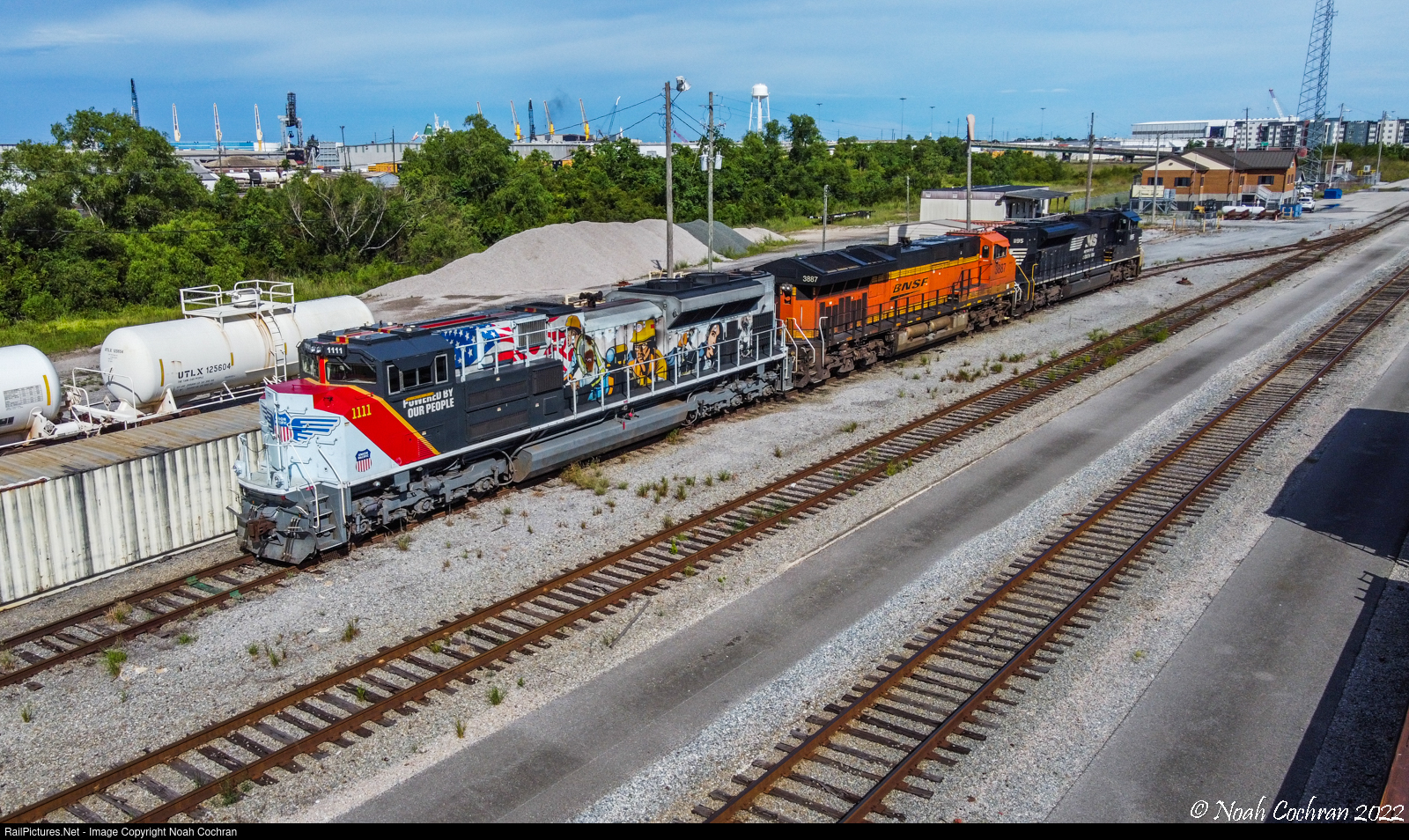 | Union Pacific’s “Powered by the People” unit #1111 rests at the NS yard office in Mobile, AL awaiting its next assignment. |