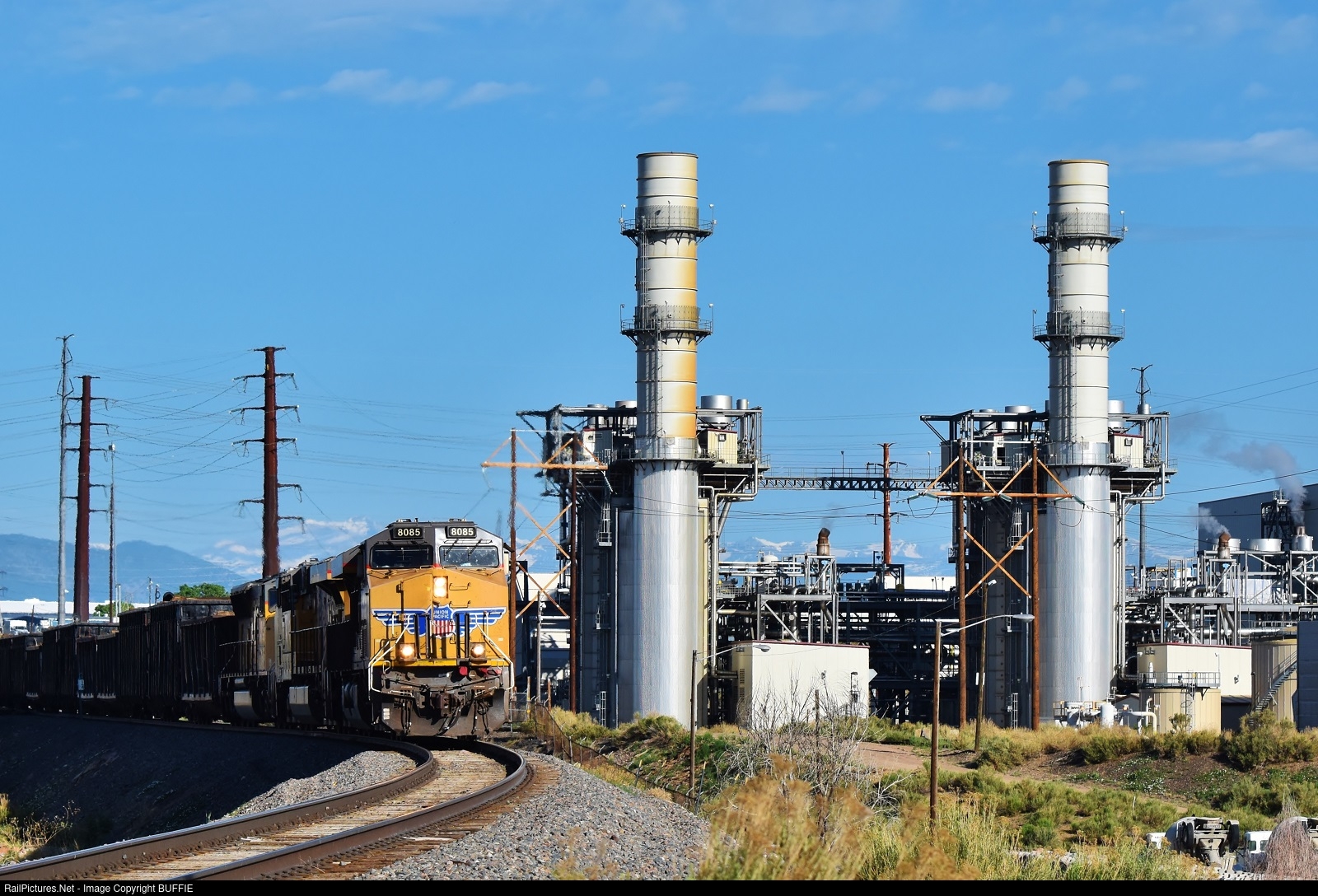 UP 8085 (AC45CCTE) runs past an Xcel power plant in north Denver as it heads towards the Greeley Sub.