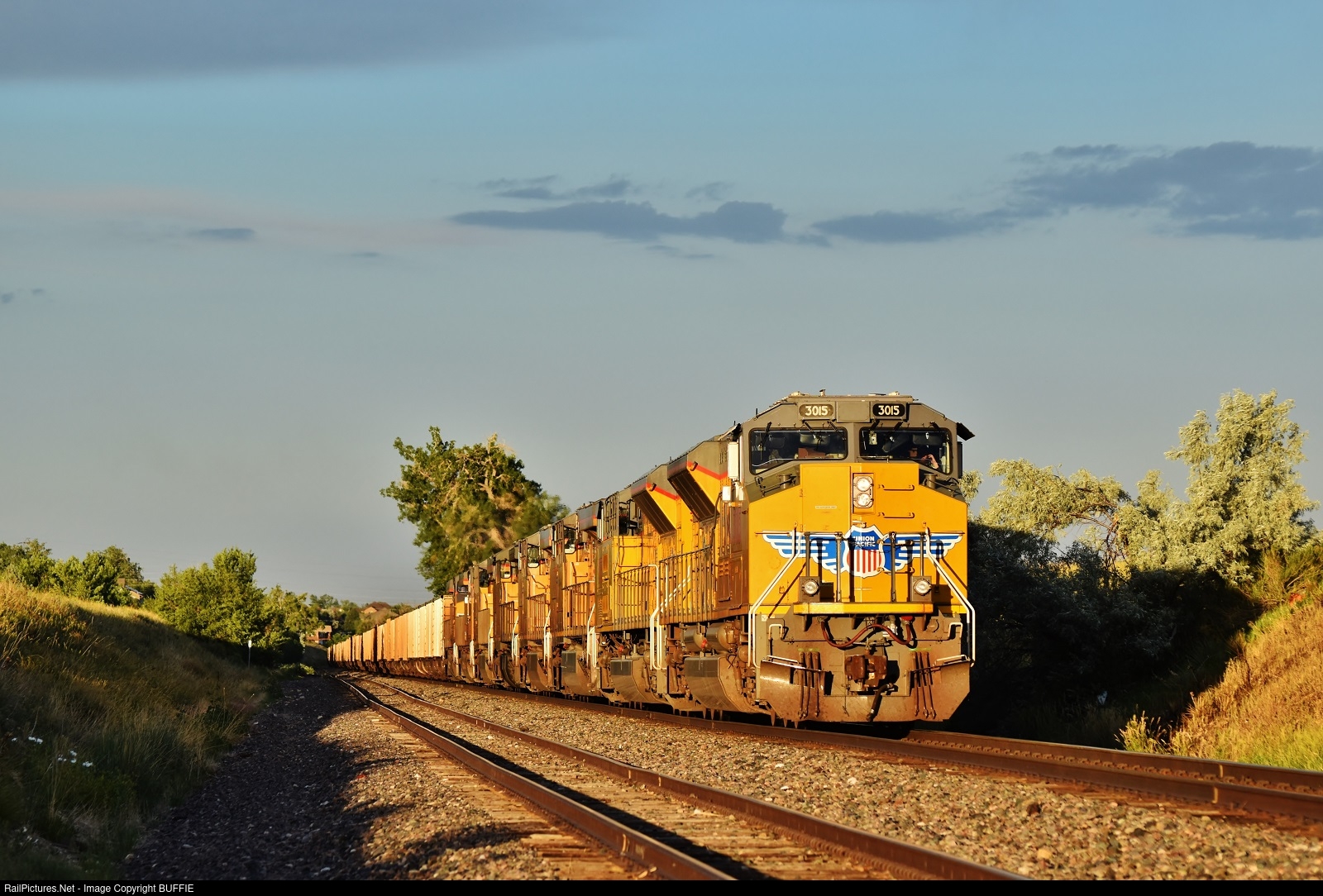 | The last few minutes of sunlight catch UP 3015 (SD70AH-T4) as it waits for a green signal to run through Arvada, Colorado on the Moffat Tunnel Sub.