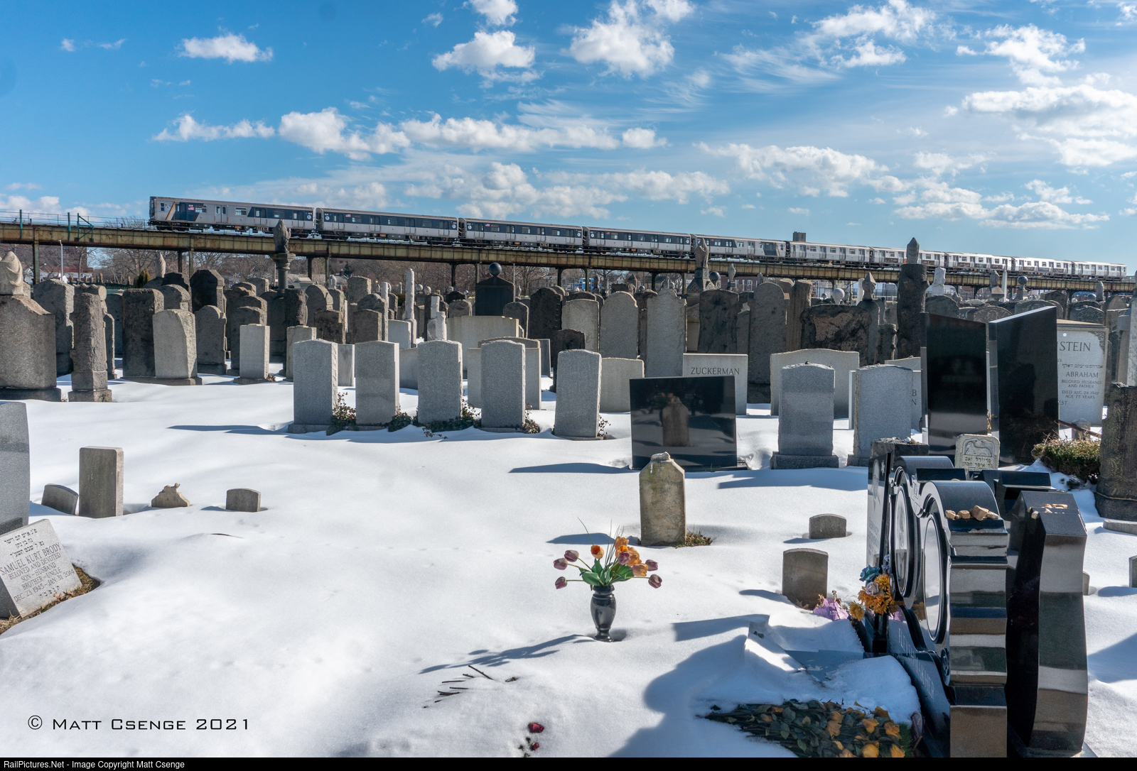 A Coney Island-bound F train passes Washington Cemetery after departing Bay Pkwy Station on the IND Culver Line.