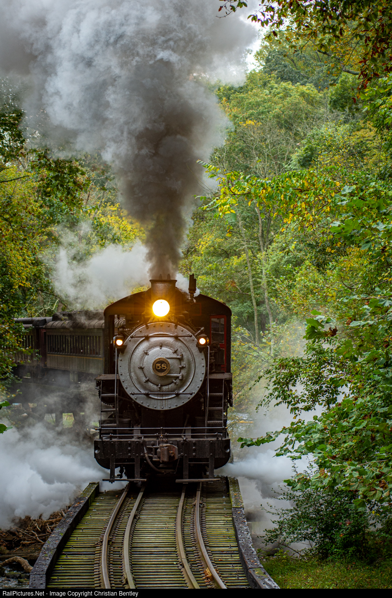 | W&W 58 brings an Autumn Leaf train filled with passengers across the "S Trestle" just outside Yorklyn mills. This also marks the beginning of Hockessin Hill, a 1.4%, 2.5 mile grade to the end of the line. |