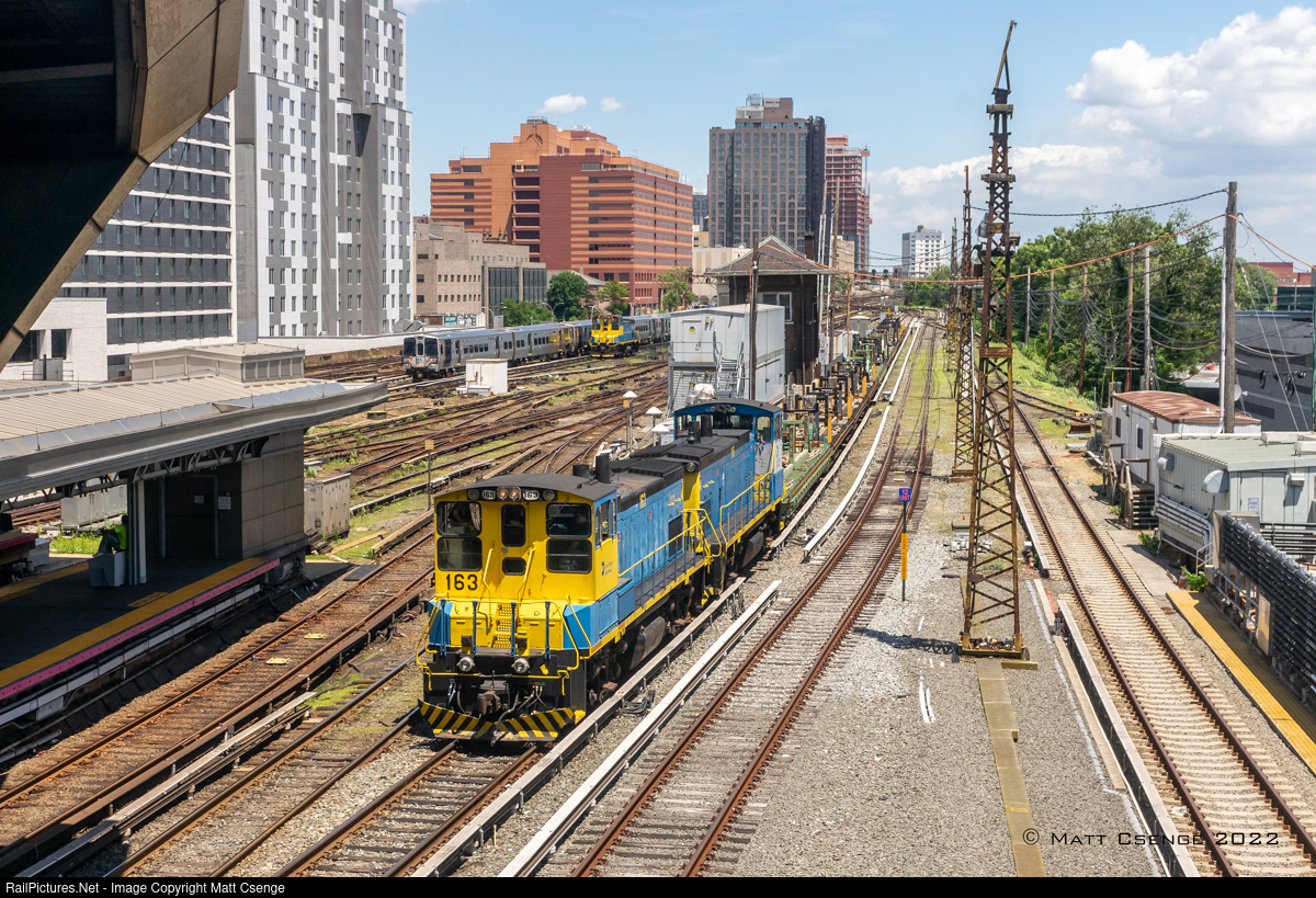Long Island Rail Road MP15AC (EMD, 1977) no. 163 leads a train of empty tie cars through Jamaica station, as seen from the pedestrian bridge above. These cars were likely bringing concrete crossties for the 3rd track project, which is making substantial progress adding another track to the Main Line. |