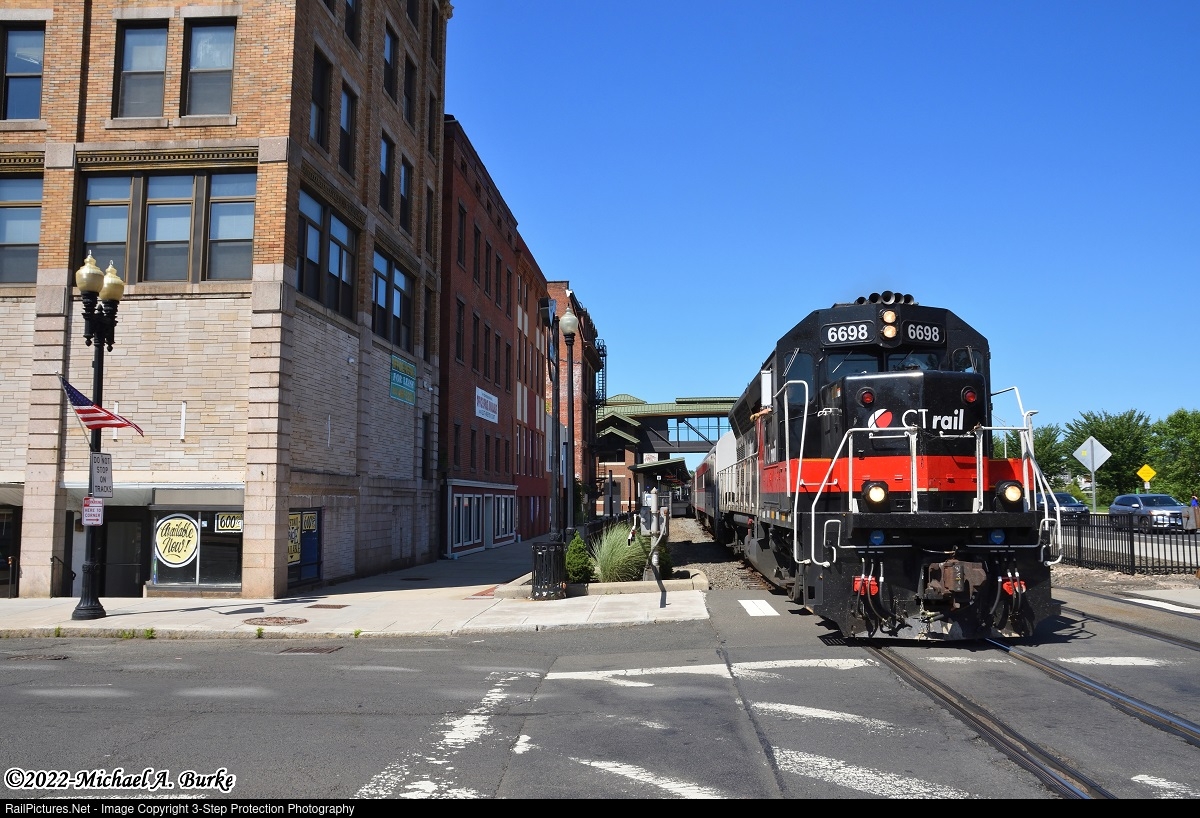 | It's a blue sky Sunday afternoon on July 4th weekend, as CTrail train 6455 crosses East Main Street in Meriden. |