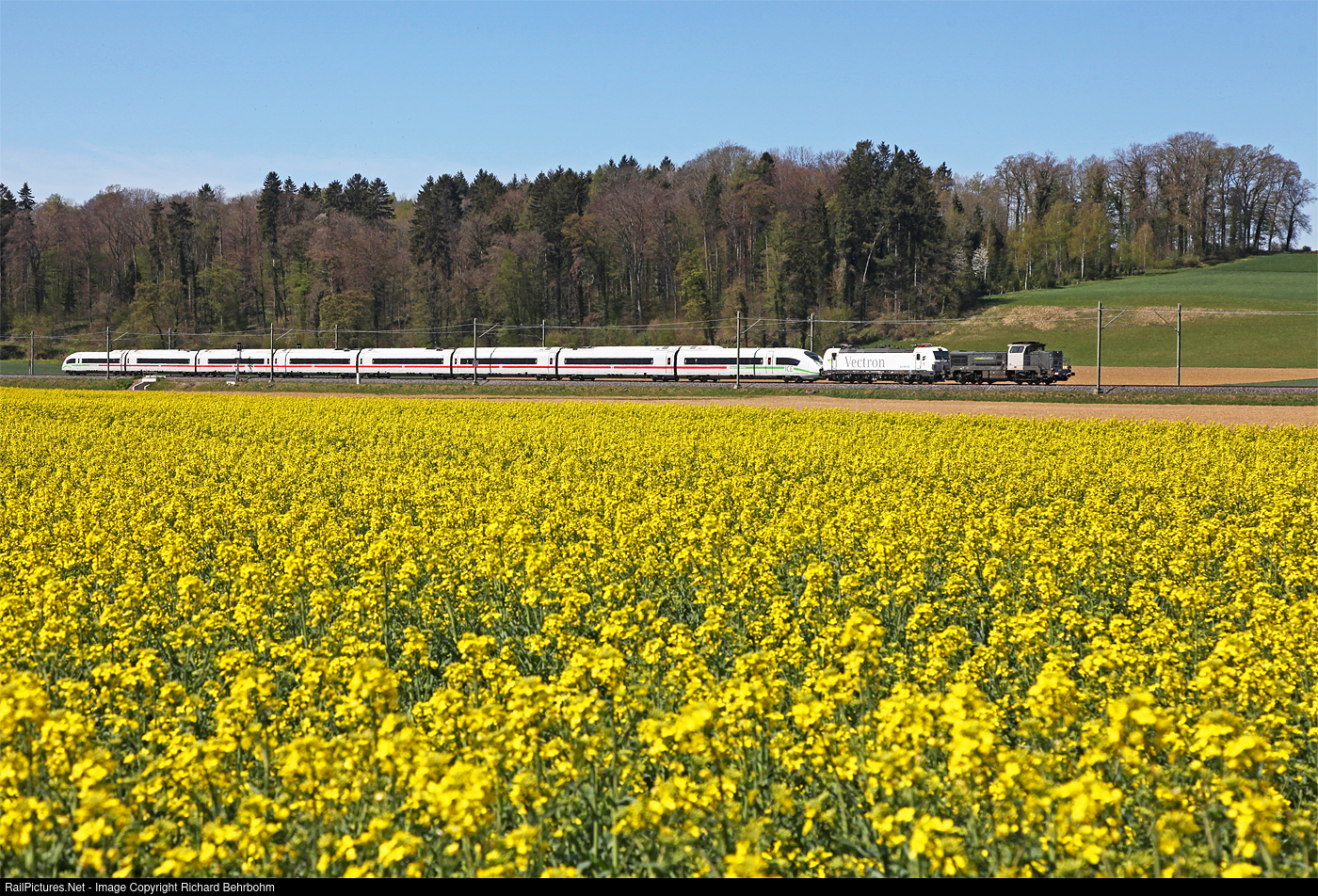 | Diesellocomotive of RailAdventure GmbH is on a transfer run with Siemens electric locomotive type Vectron 193 930 and ICE4 407 011 of Deutsche Bahn from Basel Bad Bf to Friedrichshafen. The diesel engine is necessary, because the line is not completely electrified. |