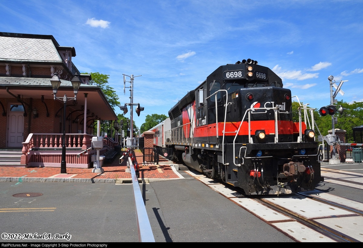 | On the afternoon of July 4th, CTrail train 6455 arrives in Windsor to make its 2:48pm stop. Due to the small boarding platform and close proximity to the crossing, trains briefly occupy Central Street. |