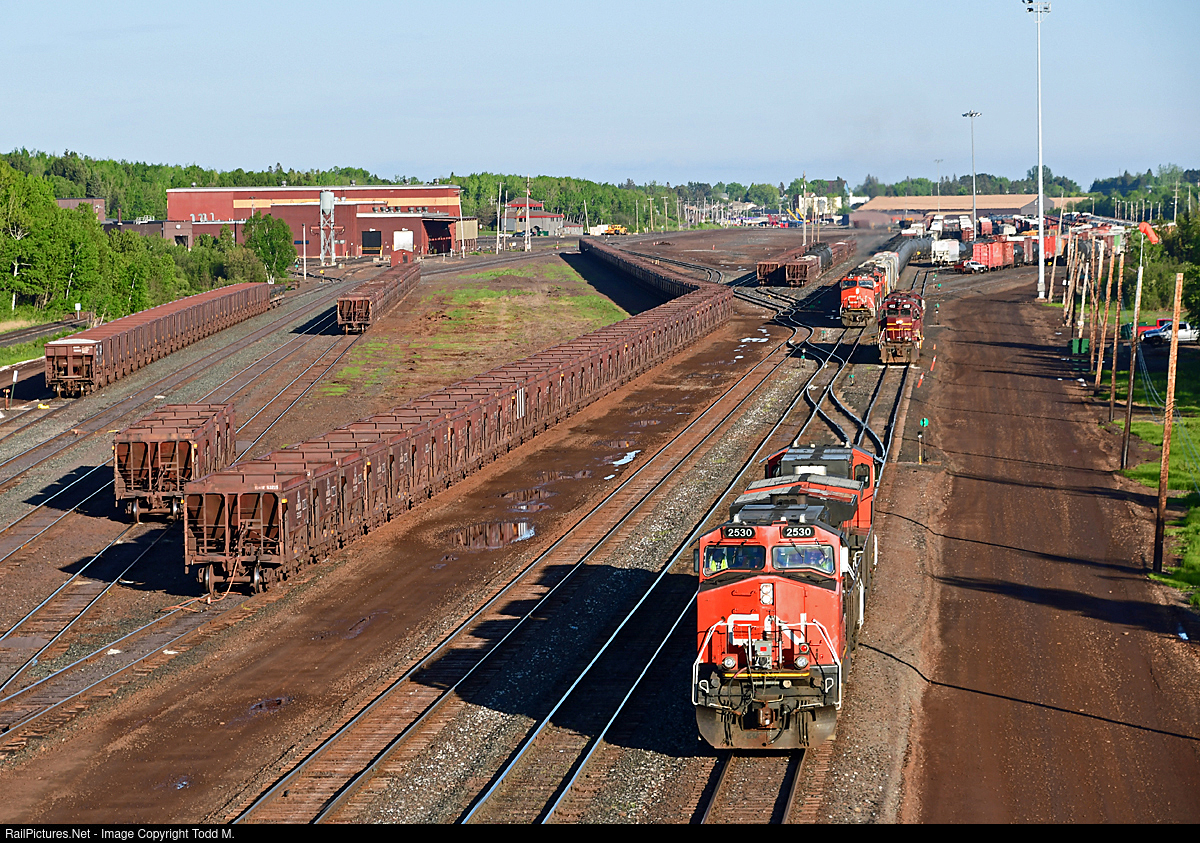 | A maroon sandwich. As transfer power eases across the yard to head back to CN's Pokegama yard over in Superior, WI, in the distance train A439 works on doubling up their train before heading to off to Winnepeg while the Missabe duo of DMIR 403 and DMIR 215 wait for everyone to get out of the way before they begin work assigned to the E-lead job in the yard. |