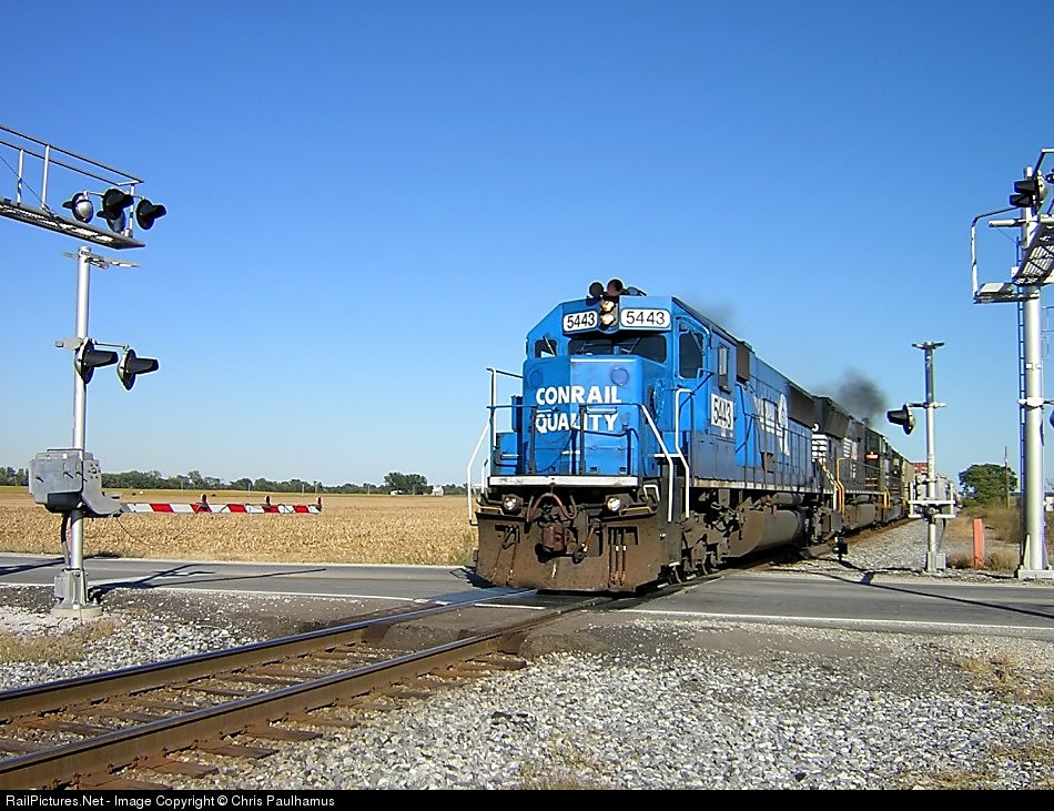 | What a lashup: A beautiful-looking blue ex-CR SD50, an NS SD70M, and another EMD smoker thunder westbound 224 past MP 33.6. Signs of fall prevail as seen in the harvested corn field... |