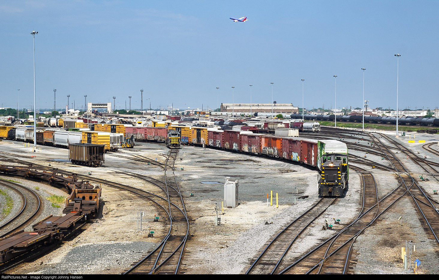 BRC 151 shuffles around boxcars on the east end of Clearing Yard on a humid summer morning while a Boeing 737-700 takes off from Midway Airport in the distance.