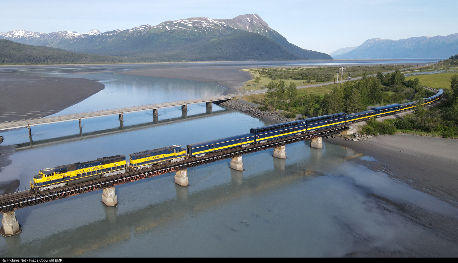 It's a beautiful morning in the Turnagain Arm area as the Coastal Classic rolls over Twenty Mile River on its way down to Seward Alaska.