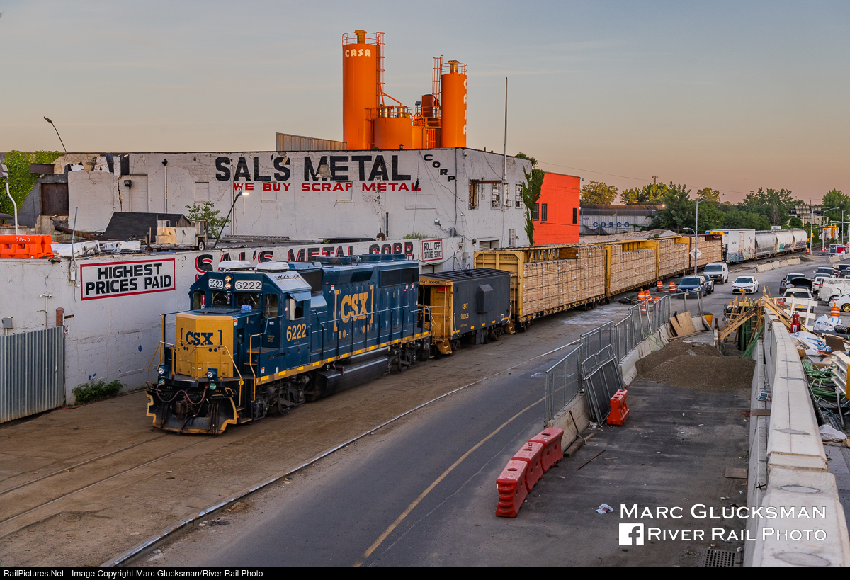 Sunset At Sal's. One of New York City's more prized freight jobs to catch is the "Market Job", the CSX run to the Hunts Point Market in the Bronx, New York. Once operated daily with designated crews in the afternoon, it has slipped to "as needed" with a job that covers a variety of what used to be separate assignments. Seen with CSXT 6222 (née-BO 4323, GP40-2, 2/1979) shoving down Edgewater Road past Garrison Avenue on Tuesday, June 14, 2022, L017-14 (formerly B750) has the look of a real local freight with shoving platform CSXT 900436 right behind the power, loaded centerbeams, and covered hoppers in addition to a refrigerated box car.