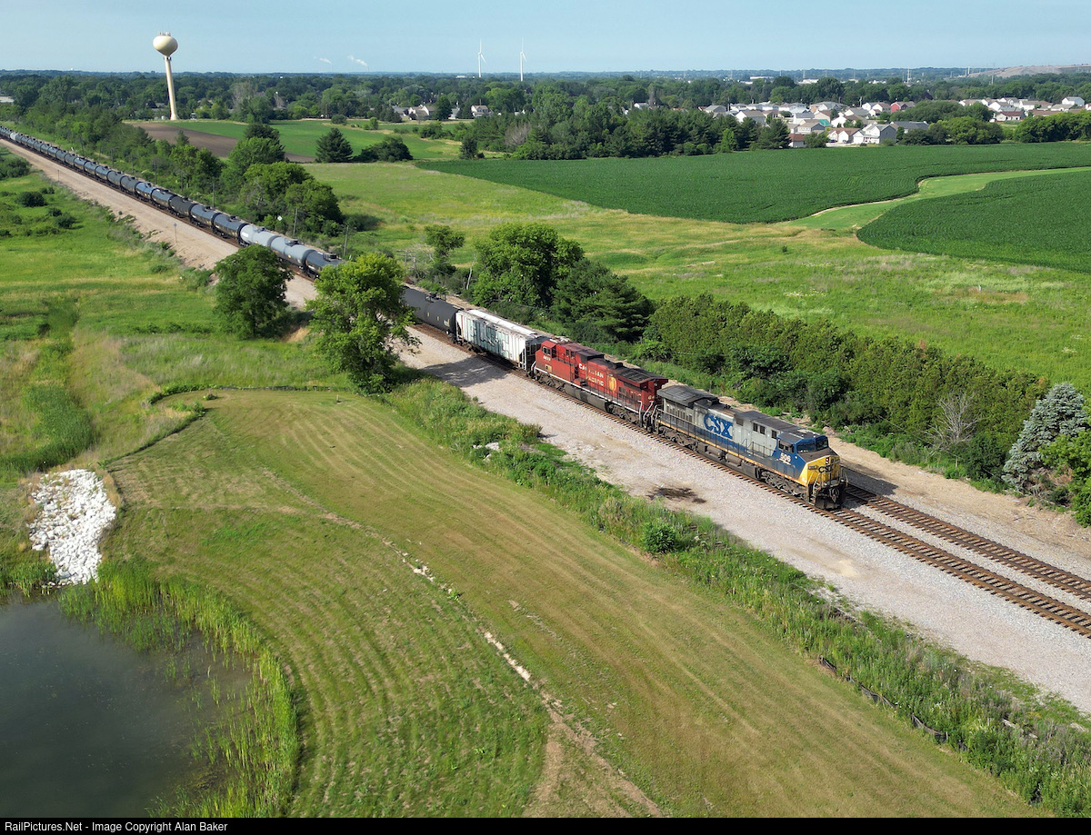 A CSX unit helps a CP unit move SB crude oil loads through the green farm land of Wisconsin south of Sturtevant.