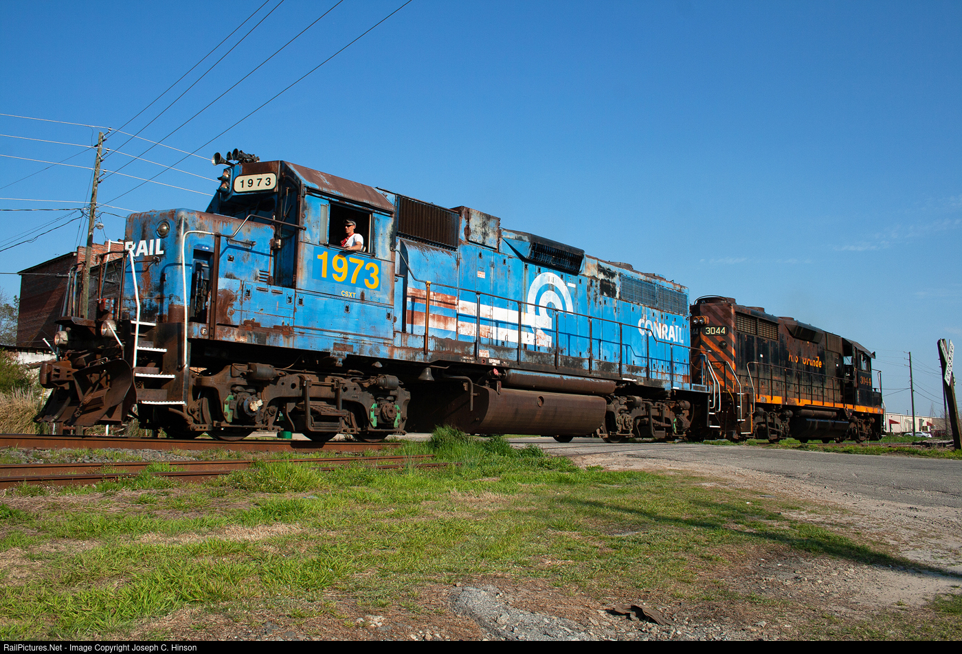 Hartwell Railroad crew rides light through Lavonia, Georgia before tying down for the day. HRT 1973 is a straight GP38 built for Penn Central in 1971 as PC 7874.