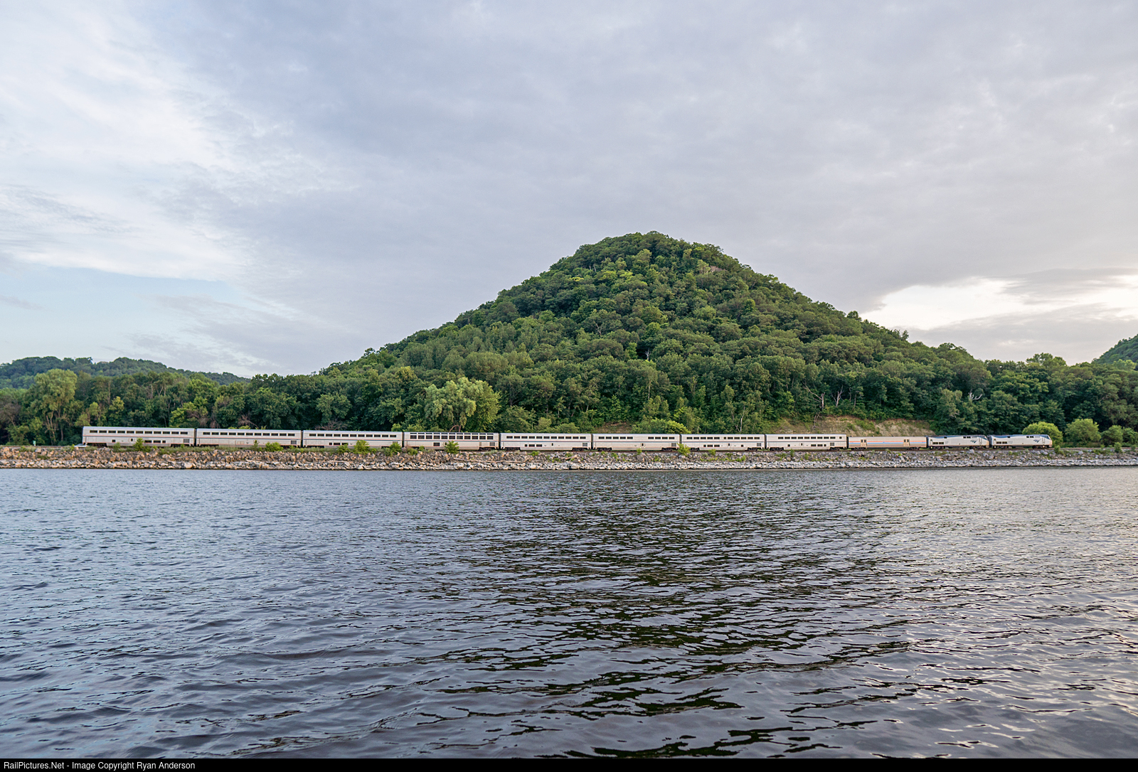 | The westbound Empire Builder soaks in the last rays of sunlight along the shores of Lake Pepin at Maple Springs. Soon a timetable change will set back the departure from Chicago making the train pass Lake Pepin after sunset. Photo taken from a canoe. |