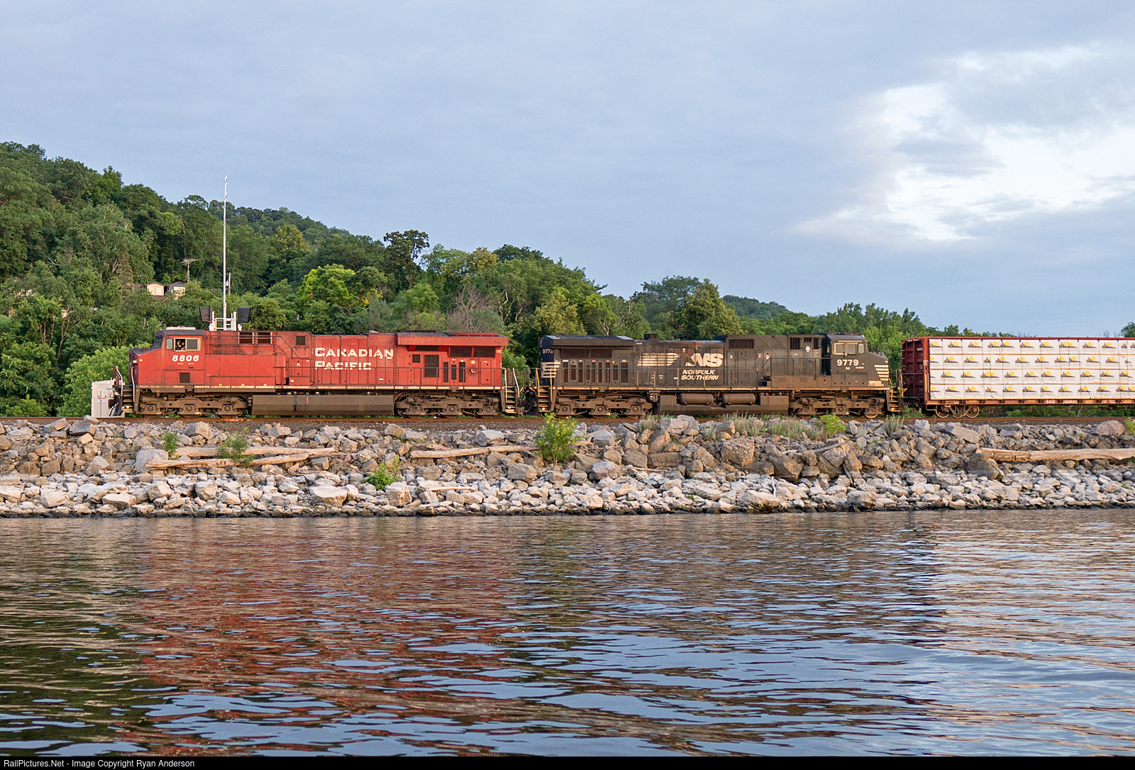 CP 8806 leads a eastbound freight train past Maple Springs just after the Empire Builder. Photo taken from a canoe.