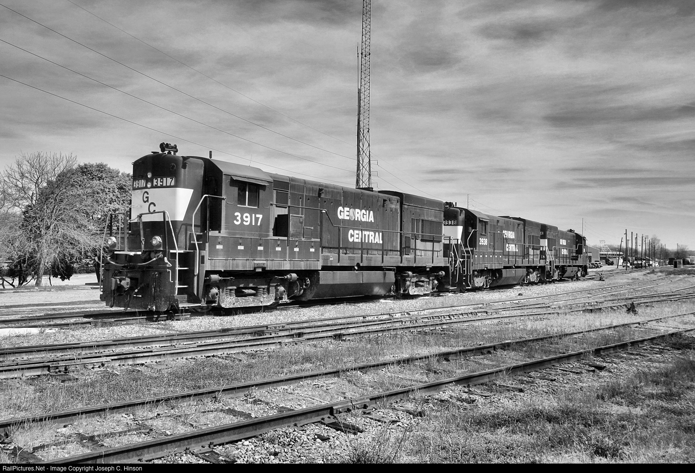 | Three big U-boats at the former Seaboard yard in Macon, Ga. The lead locomotive was built for the Southern Railway in 1974 as SOU 3917, then became NS 3917 before being sold to Georgia Central. When Genesee & Wyoming bought the Georgia Central, they eventually scrapped all of these vintage units with the exception of one which was saved for a museum. |