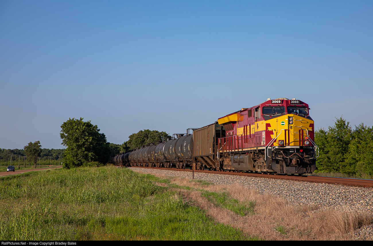| Canadian National's Wisconsin Central Heritage ET44AC Locomotive #3069 acts as the DP unit on northbound Tanker Train U261, seen here passing through the Mississippi Delta at Mileston, MS. |