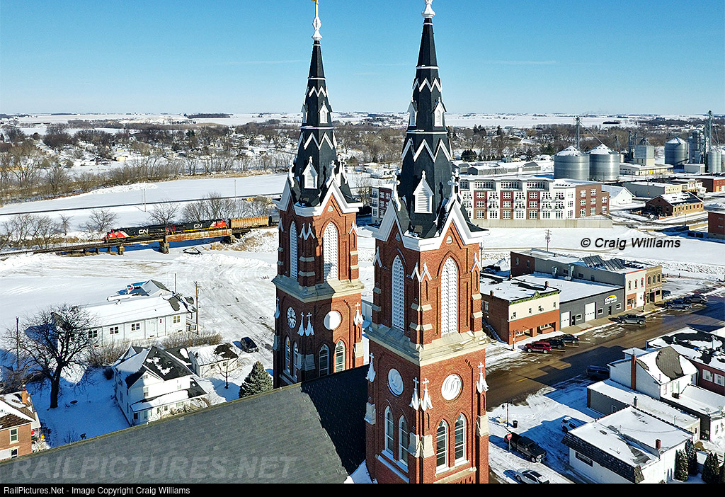 | An empty Dyersville Big River ethanol train pulls out of the siding at Dyersville after meeting 338. The crew is only 2 miles from the train's destination. They cross the North Fork of the Maquoketa River with the beautiful Basilica of St. Francis Xavier Catholic Church in the foreground. The cornerstone of the church was laid on June 3, 1888, and was done and dedicated on December 3, 1889. The place was hoping as many are gathering for Sunday mass on this cold winter day. |
