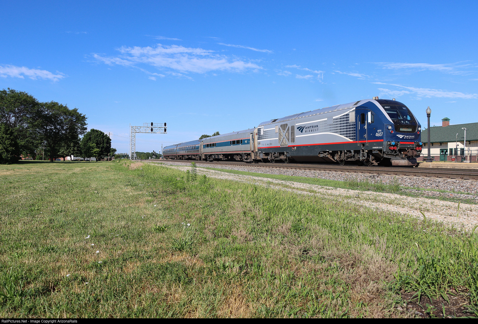 | Amtrak's northbound Illinois Zephyr departs it's station stop in Galesburg, running about 40 minutes late bound for it's final destination of Chicago on a beautiful morning in early July. |