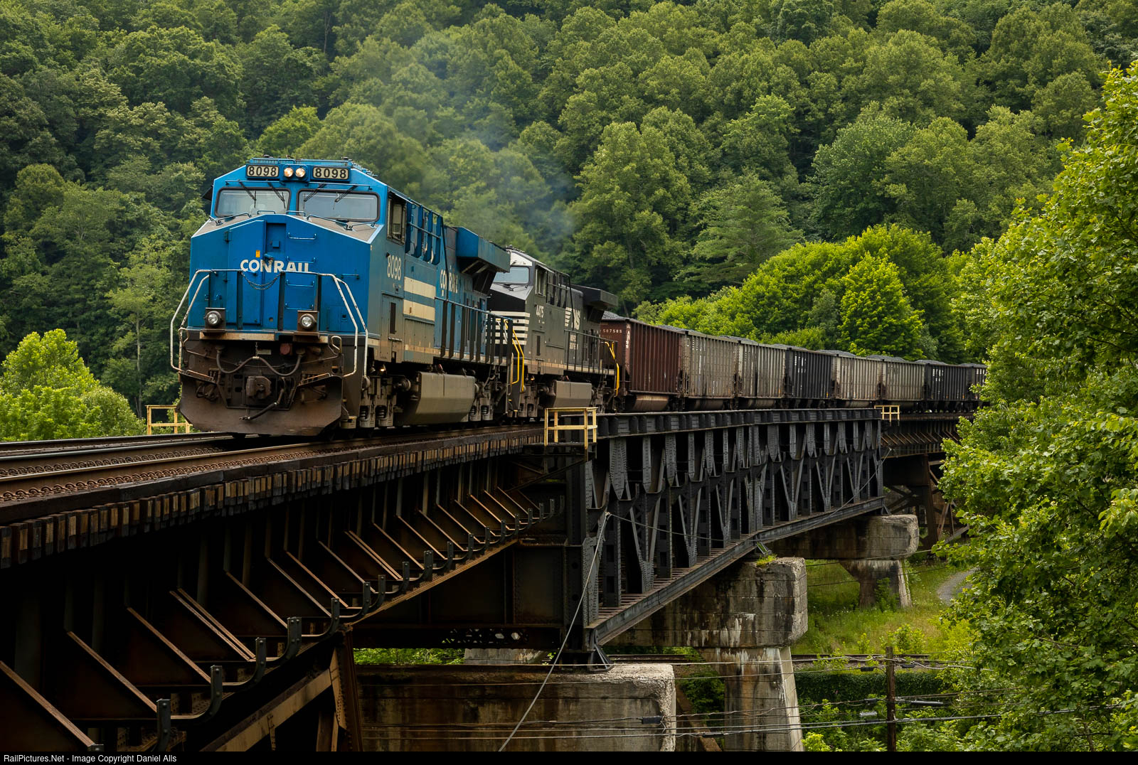 The Conrail heritage unit is in pusher service on the Pocahontas district and is seen here pushing a heavy loaded coal train over Coopers trestle.