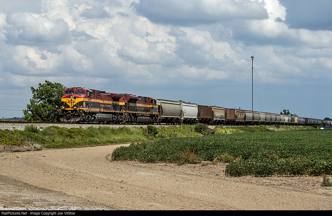 A KCS grain train has just passed over the Mississippi River as it passes some farmlands of Louisiana.