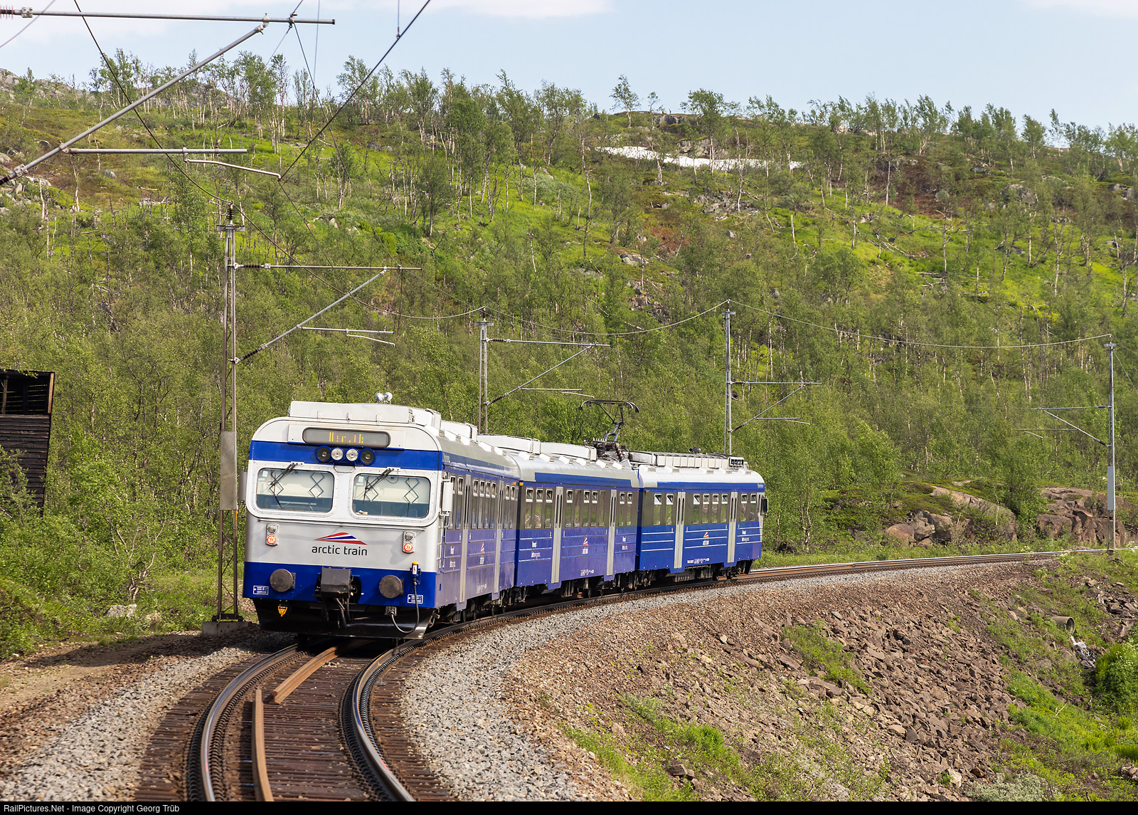 | After a short stop to leave 1 passenger (myself) in Søsterbekk, the electric train BM 69 # 070 of the Artic Train continues its journey. The tourist train 73453 is running from Narvik over the Ofot railway line till Abisko Oestra in Sweden, and then back in the afternoon. The operator is Tm Togdrift AS in Narvik. The railcar was taken over from Norske Tog in 2018 and circulated on the Gjøvikbane befor. |