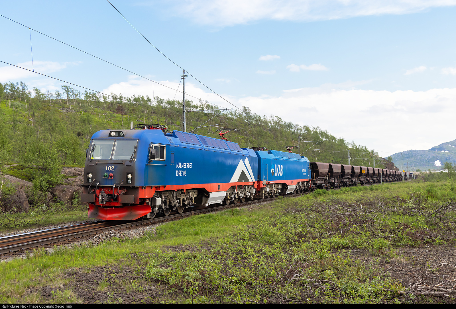 | IORE locomotives # 102 "Malmberget" and # 129 "Nattavaara" of the LKAB Malmtrafik AB in multiple control are pulling the loaded ore train 9910 from Kiruna to Narvik near Søsterbekk. The train has 34 double cars with a gross weight of up to 8600 ton and a length of over 700 meter. |