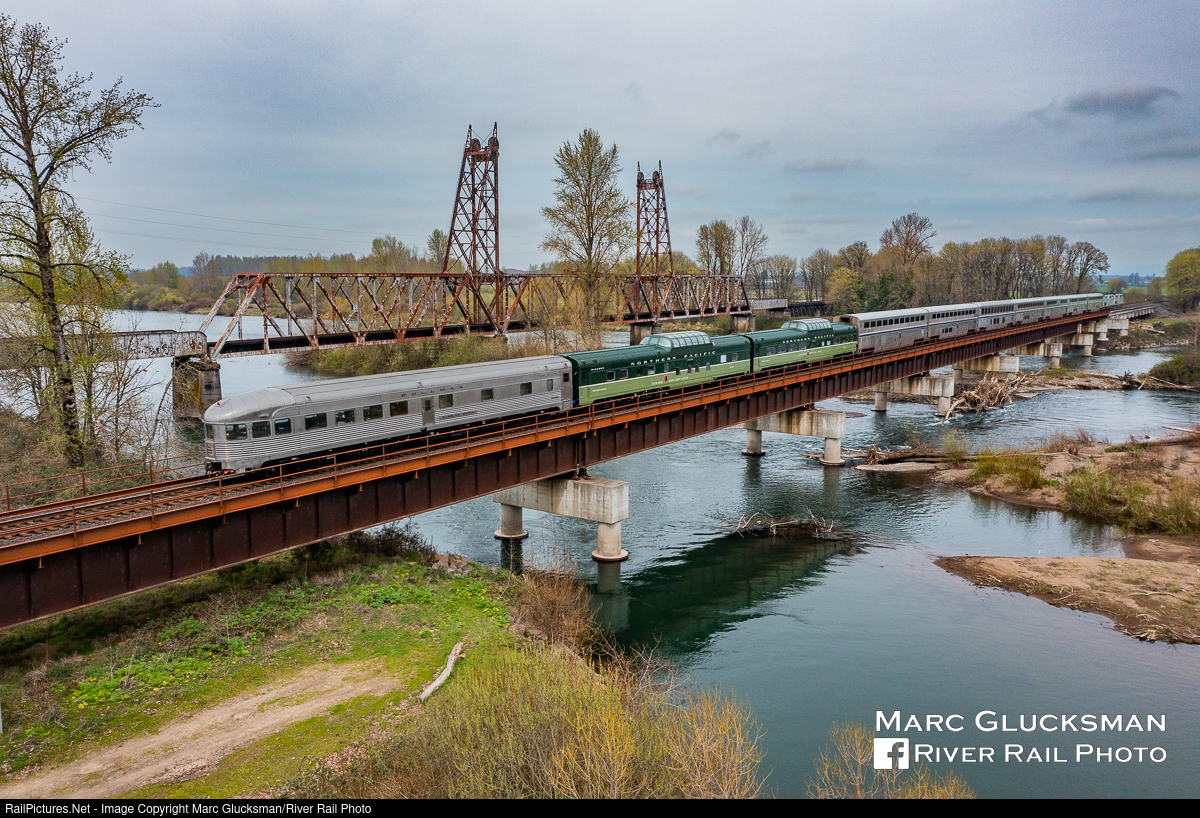 Harrisburg Bridges. Union Pacific Railroad constructed its new bridge over the Willamette River in Harrisburg, Oregon during five 30 hour outages between 2013-2014, replacing a 1906 span with pre-fabricated sections. On March 27, 2022, Amtrak Train 14 (Coast Starlight) crosses that bridge with Webb Rail's former Northern Pacific Railway Budd built Pullman dome/sleeper 313 (WEBX 801044), former Northern Pacific Railway Budd built dome/coach 549 (WEBX 801045), and former New York Central Railroad Budd built Pullman obs/diner/sleeper "Babbling Brook" (WEBX 800007) holding the markers. Although not identical, in the background the Portland and Western Railroad (PNWR) bridge, built in 1910, is of similar vintage and still remains in service. More on the Webb Rail fleet at www.webbrail.com