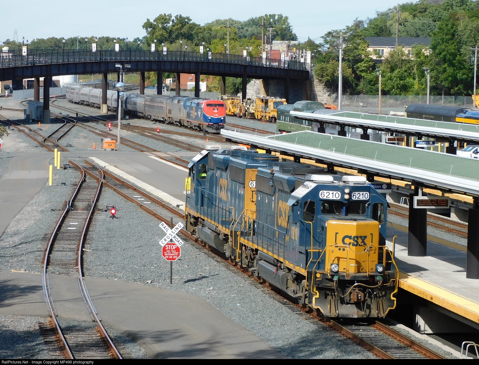 | After dropping off a private car to Amtrak for the upcoming autumn express, CSX loacal B761 is seen at the Rensselaer Amtrak station waiting for clearance to head back to South Schenectady Yard. They will proceed west once Amtrak's "Lakeshore Limited" clears which is seen in the background arriving at the station with Amtrak 50th anniversary unit 108 leading. |