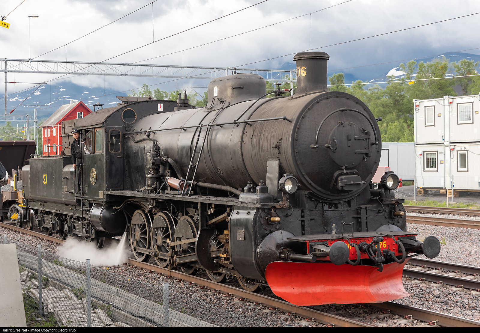 | It is 05 AM and the 0-10-0 steamlocomotive R # 976 of the Swedish Railway Museum is entering some minutes ahaed of schedule the station of Abisko Oestra with the 1300 ton ore train 50976 from Kiruna to Vassijaure. The train circulated in the night of july 2/3 to celebrate 120 years of operation on the ore line Kiruna-Narvik. The steamlocomotive, built in 1909 by NOHAB for this purpose, performed well on this jourey, which was observed, filmed and photographed by a large group of enthusiast from the whole world. |