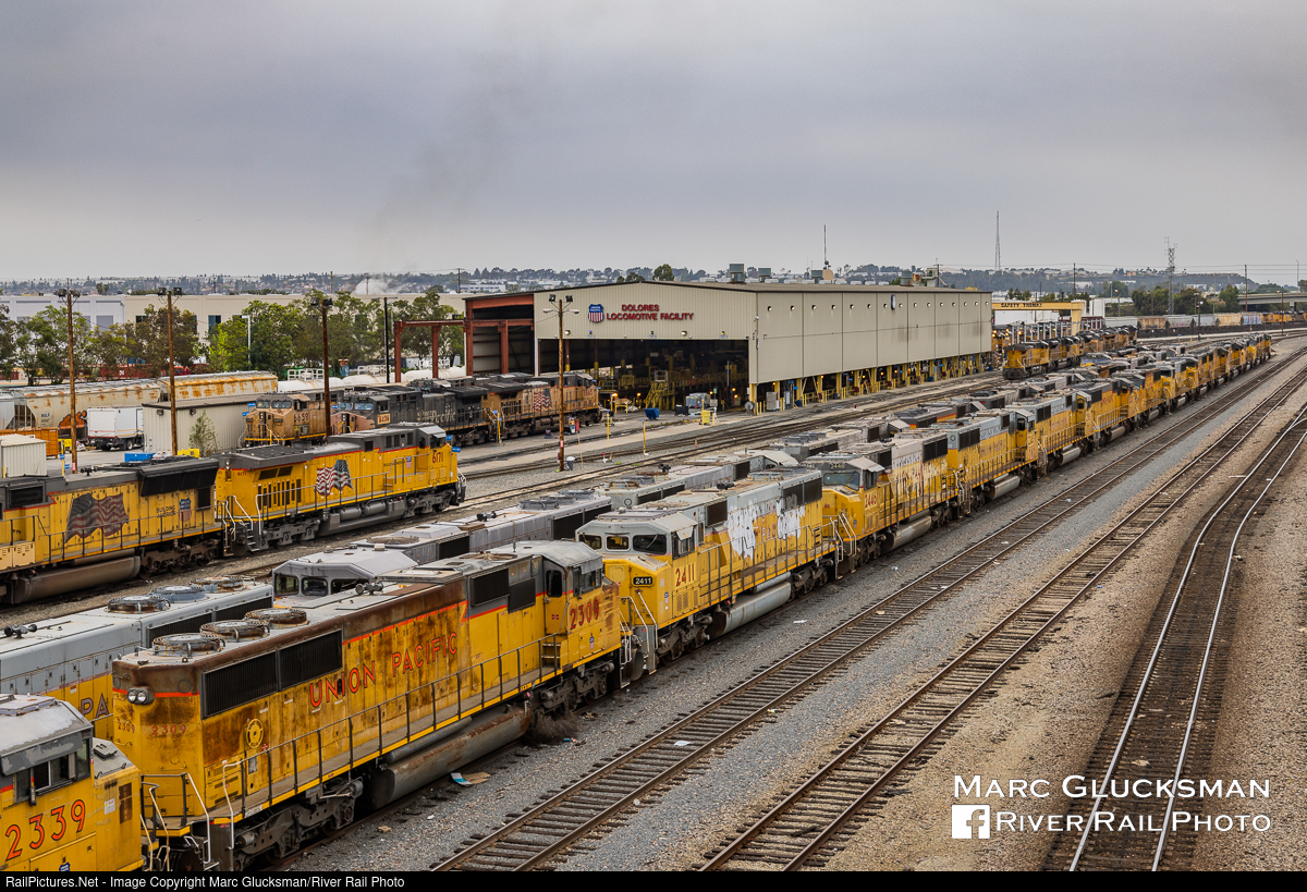 Diesels In Dolores. On a typically hazy southern California day, the storage and service tracks at Union Pacific Railroad's Dolores Locomotive Facility in Carson, California are occupied with a variety of units on Saturday, April 2, 2022. More than 2 dozen SD60Ms with a mix of 2 window and 3 window "Triclops" cabs appear to have made their final revenue runs for the railroad. By the building, UP 6236 (née-SP 257, AC44CW) is noticeable for its semi-patched appearance, distinctive from the otherwise armour yellow field, but UP 6171 (née-SP 131, AC44CW) is a fellow vet of the Espee that is hiding in newer flag paint in plain sight.